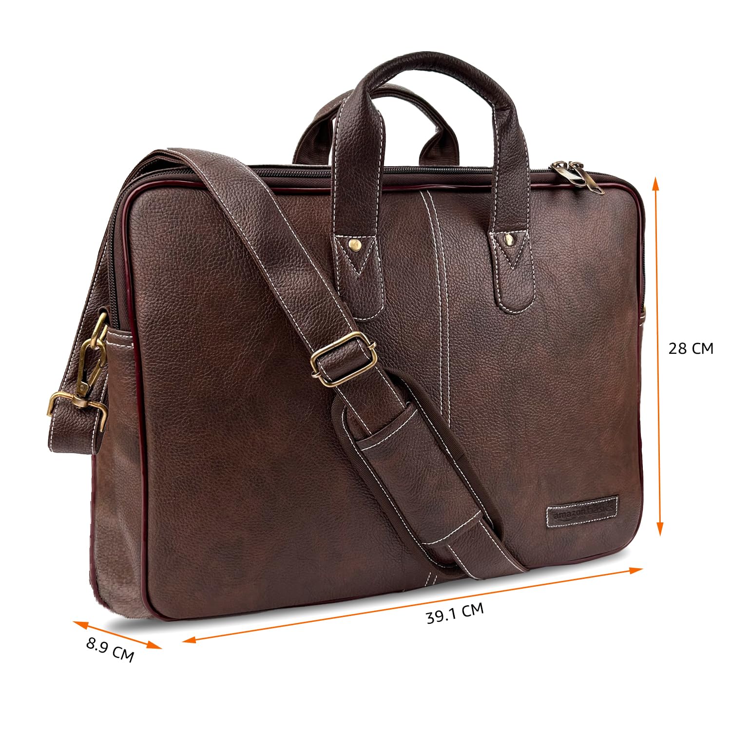 Introducing the Amazon Basics Synthetic Leather Laptop Bag, a stylish and functional choice for men. Crafted with varying degrees of water-resistant materials, it ensures protection for your electronics and documents from rain or spills. The ergonomically designed adjustable shoulder strap provides customizable comfort, reducing shoulder strain with its padded section. Built with heavy-duty construction, including reinforced areas and stitching, it withstands daily use and prevents wear and tear. Featuring dual carrying options with a top handle, it offers versatility for crowded spaces or overhead compartments. An ideal gifting choice, combining functionality with style for travel and everyday use.