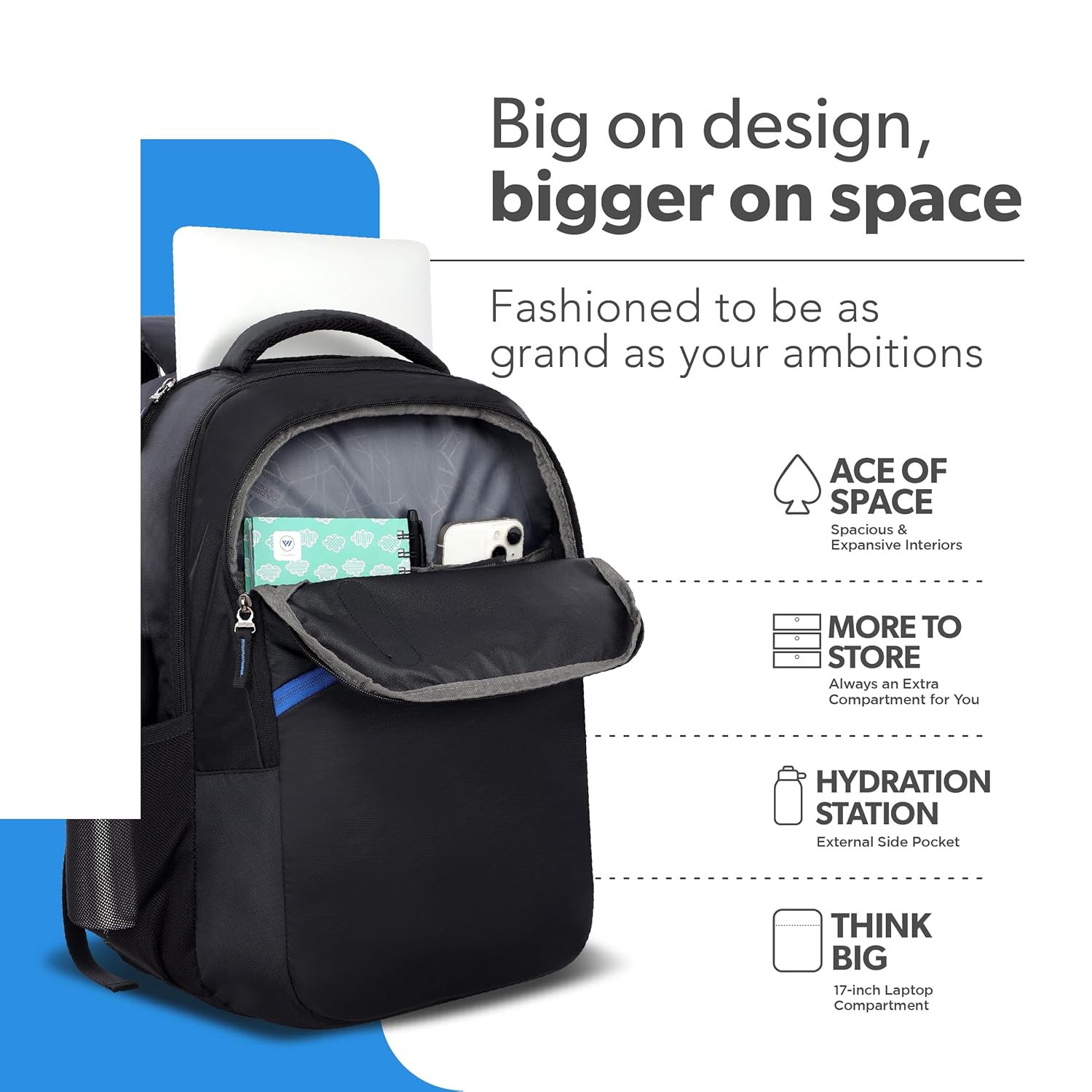 With a handy front compartment for swift access, roomy interiors, and two external pockets for water bottles, keeping organized and hydrated on the go is achievable effortlessly.