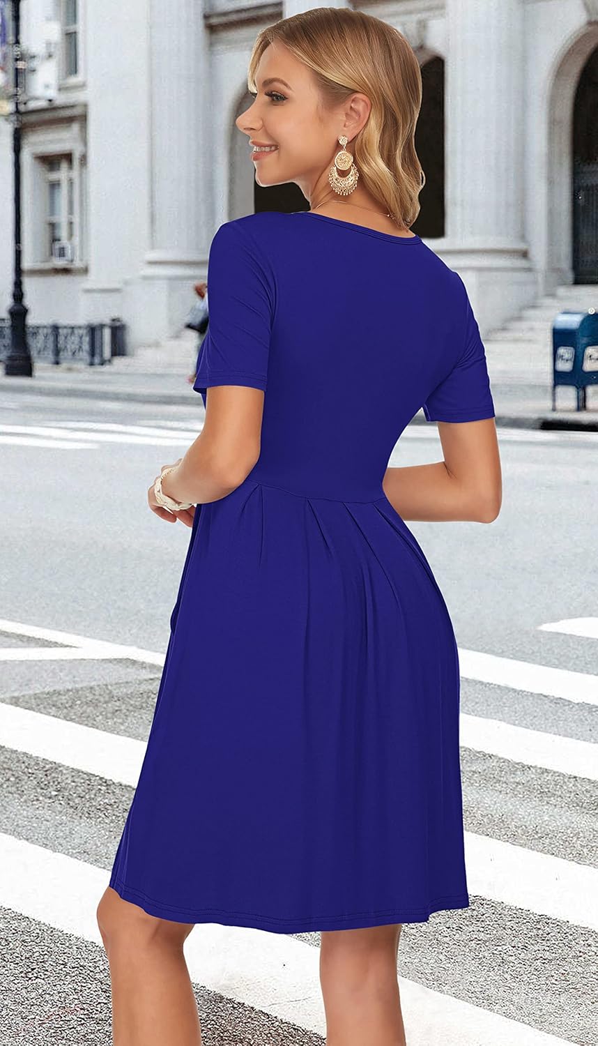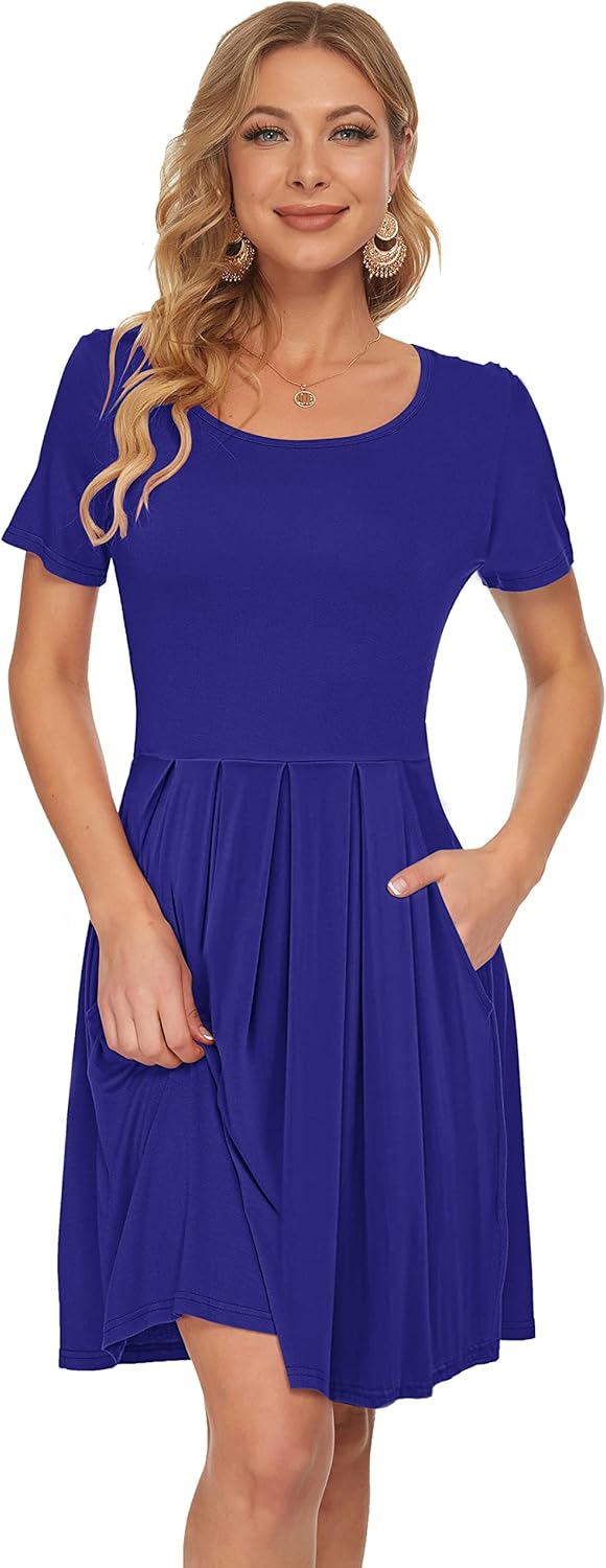 AUSELILY Women’s Short Sleeve Summer Dress Pleated Loose Swing Knee Length Dresses with Pockets 2025 New
