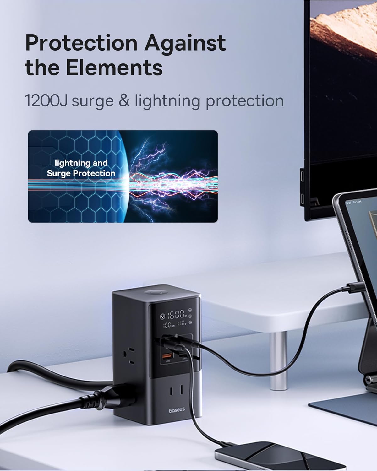 【1200J Surge & Lightning Protection】This power strip has a surge protector that comes with a 1200J surge and lightning protection and 9 additional safety protections.