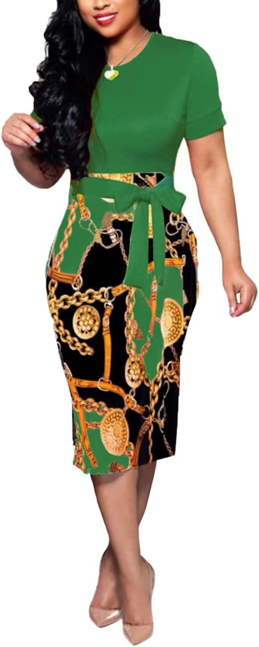 Women’s short sleeve round neck floral bodycon pencil dress with self tie belt