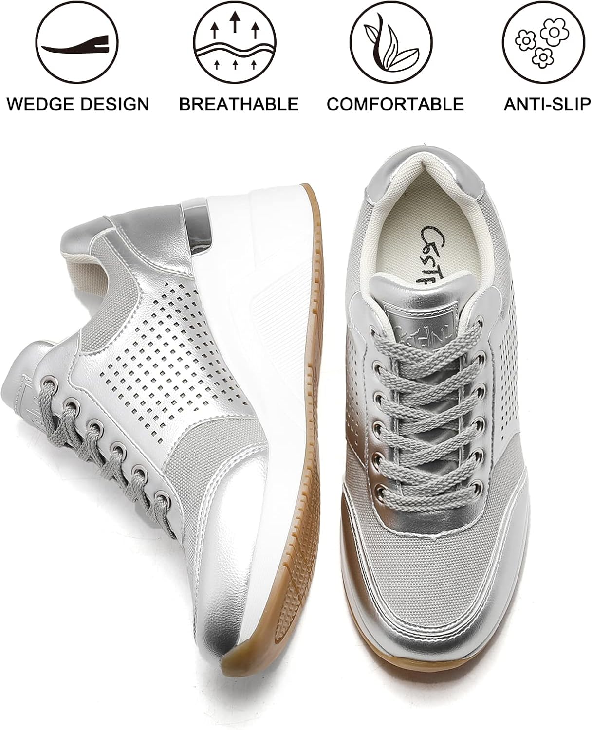 Customers find these sneakers comfortable, true to size, and versatile, with one noting they don’t pinch the little toe. They appreciate the style, with one mentioning the flattering heel and another highlighting the shimmery mesh accents, while also praising their lightweight design and good value for money. Customers like the height, with the wedge being neither too high nor too low, and find them sturdy for the price. However, several customers report sizing issues, finding them very narrow.