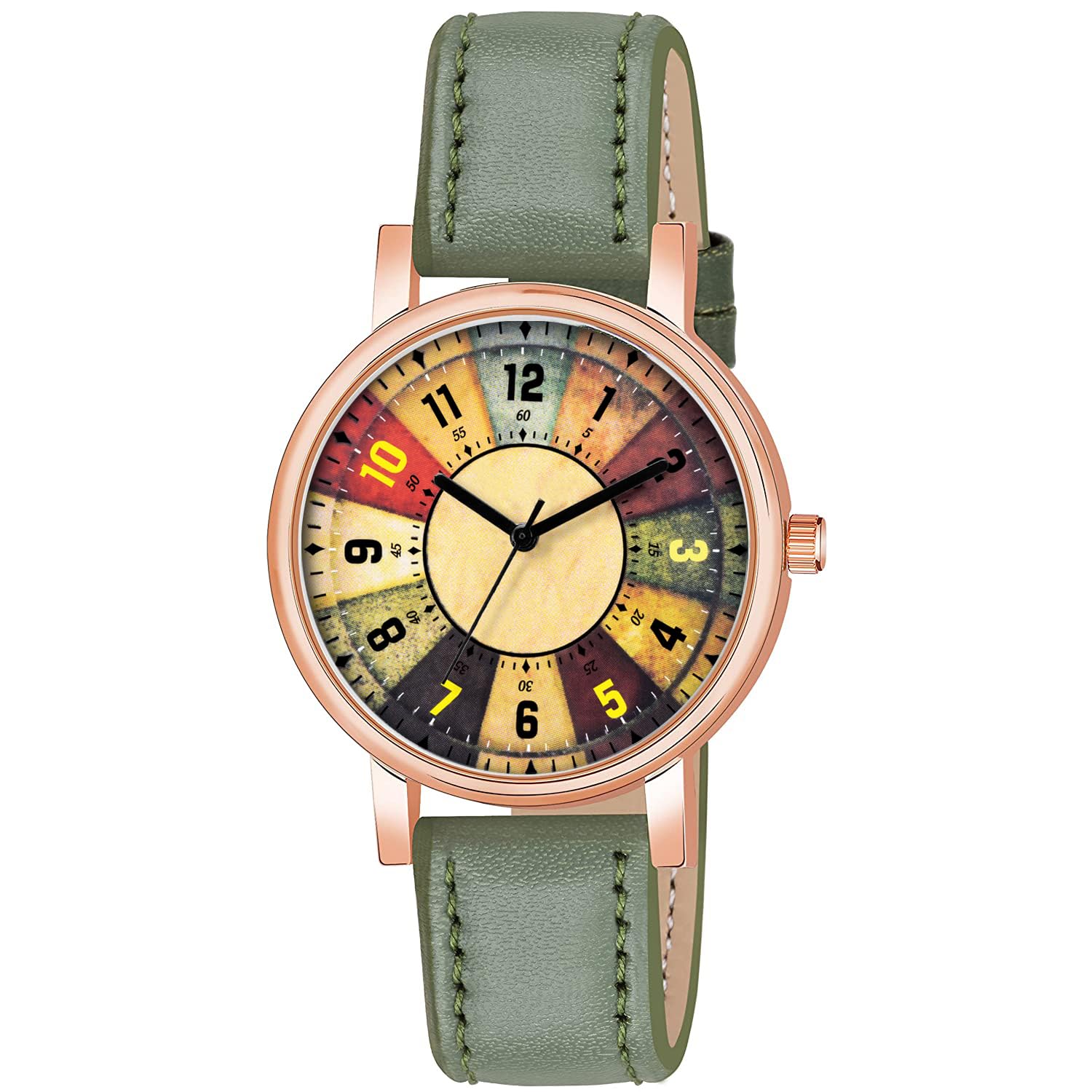 Gadgets World Analog Round Yellow Dial Stylish Green Strap Creative Fashion Wrist Watch for Women and Girls, Pack of 1 – C36-VINTAGE-GRN-L