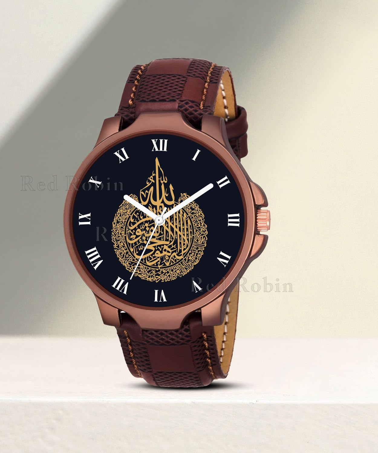 Gadgets World Analogue Islamic Design Round Dial Latest Fashion Attractive Leather Brown Strap Stylish Wrist Watch for Muslim Men and Boys, Pack of 1