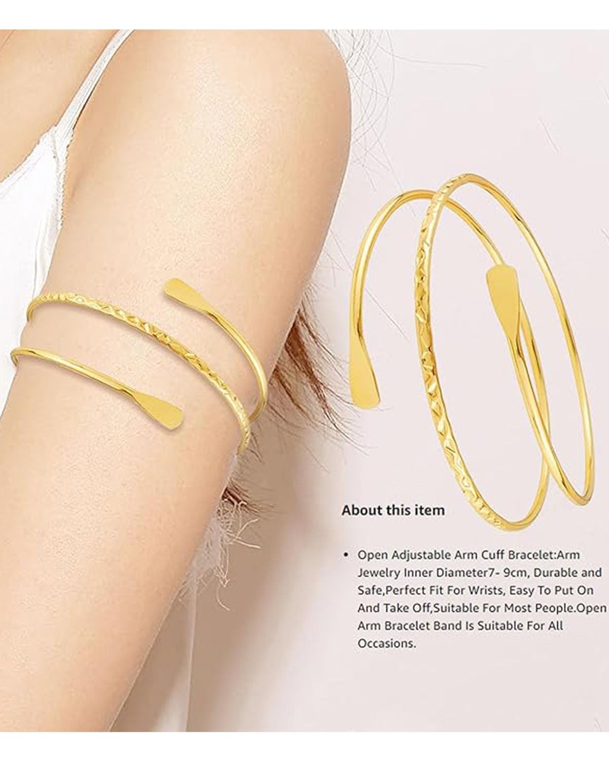 Gold Arm Cuff, Arm Cuff Jewellery for Women, Elegant Gold Bracelet Set, Adjustable Armlet Bangle, Stylish Accessories for Any Occasion, Upper Arm Band Bracelet Elegant Design: This gold arm cuff set includes two stylish pieces, a knotted design and a triple-layer design, perfect for adding a touch of elegance to any outfit; The intricate details and high-quality craftsmanship ensure a luxurious look. Adjustable Fit: Designed to fit most arm sizes, these arm cuffs are easy to adjust for a comfortable and secure fit; The flexible design allows for a custom fit without compromising style, both featuring intricate details and a luxurious gold finish. Versatile Style: Suitable for various occasions, from casual outings to formal events; The gold arm cuff jewellery complements any wardrobe, making it a versatile addition to your collection. Whether you’re dressing up for a special event or adding a stylish accent to your everyday look, this gold arm cuff jewellery is a must-have accessory. High-Quality Material: Made from high-quality materials with a gold finish, these arm cuffs are designed to last; The lightweight construction ensures comfort during extended wear. It makes you more attractive, charming, fashion and catch people’s eyes. They also a great relaxation and sensory tool. Perfect Gift: Ideal for gifting to loved ones on special occasions like birthdays, anniversaries, or holidays; The elegant design and premium quality make it a thoughtful and appreciated present. It also makes a thoughtful gift for loved ones on birthdays, anniversaries, or holidays.