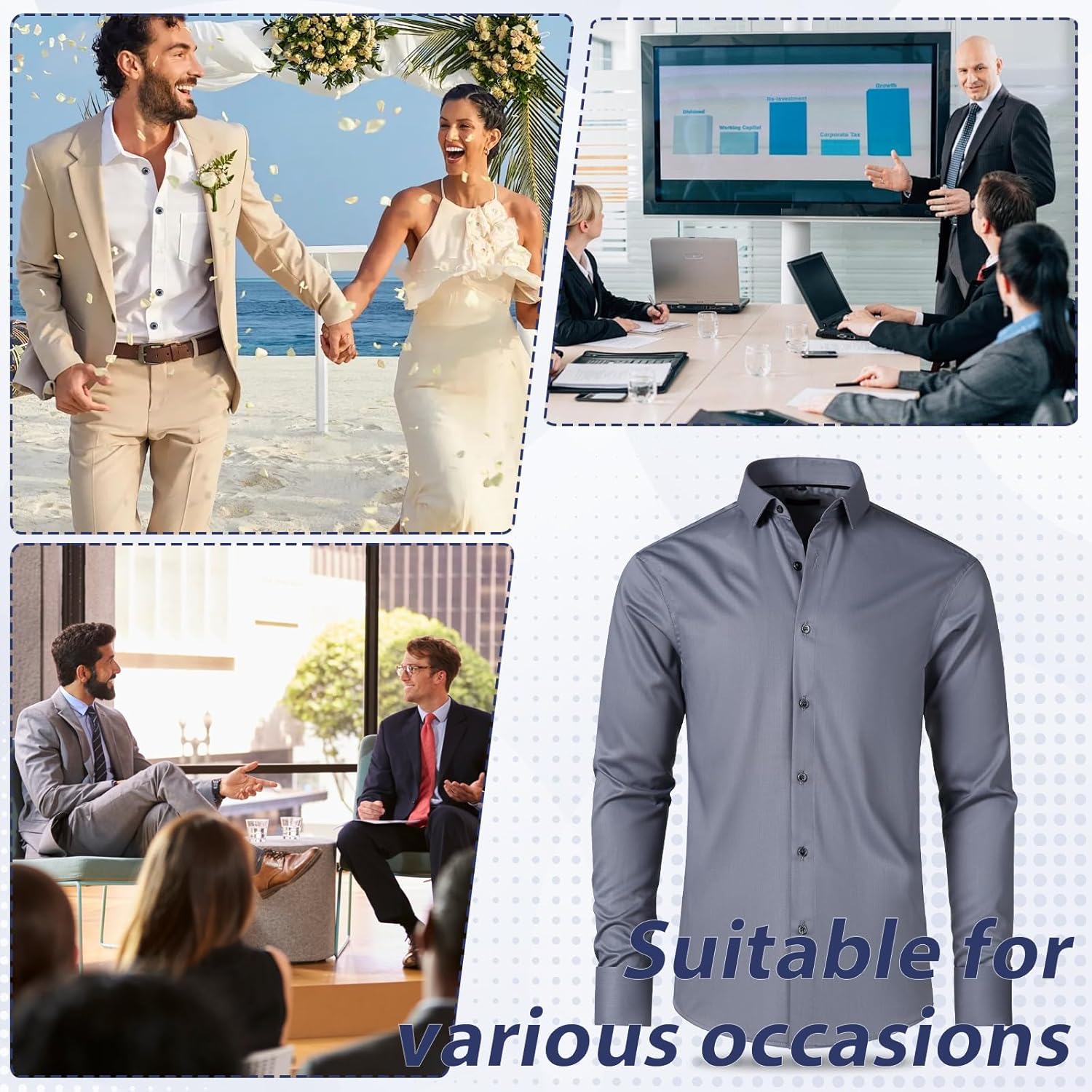 Customers find the dress shirt excellent in appearance, with one noting it can be dressed up or down, and appreciate its smooth, fantastic-feeling material and high-quality construction. Moreover, the shirt comes with attractive cuff links and offers great value, with one customer mentioning it worked well for a wedding. However, the fit receives mixed feedback, with some finding it perfect while others report sizing issues, and the color accuracy is also mixed, with some saying it’s on point while others find it too dark.