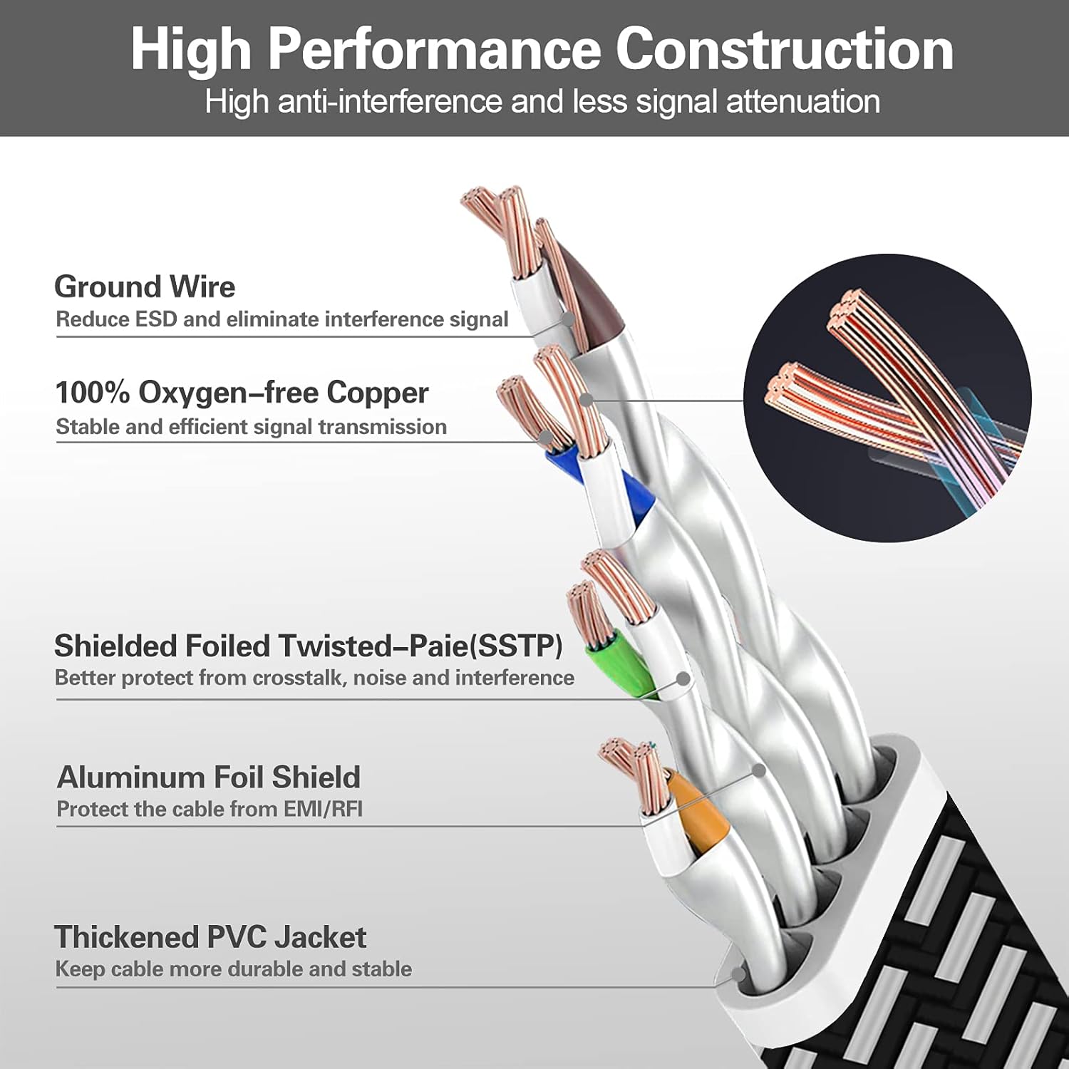 🚀 Amazing Transfer Speed: HiiPeak CAT8 nylon braided flat Ethernet patch cable is designed for use of 40 Gigabit Ethernet, providing the fastest performance of up to 2000MHz and speeds of up to 40Gbps. Double-shield (SSTP) to avoid interference and data losses, maximum the network speeds to download, online 4K 8K video streaming, E-sports gaming, and other data at high speed without worrying about slow network Speed.