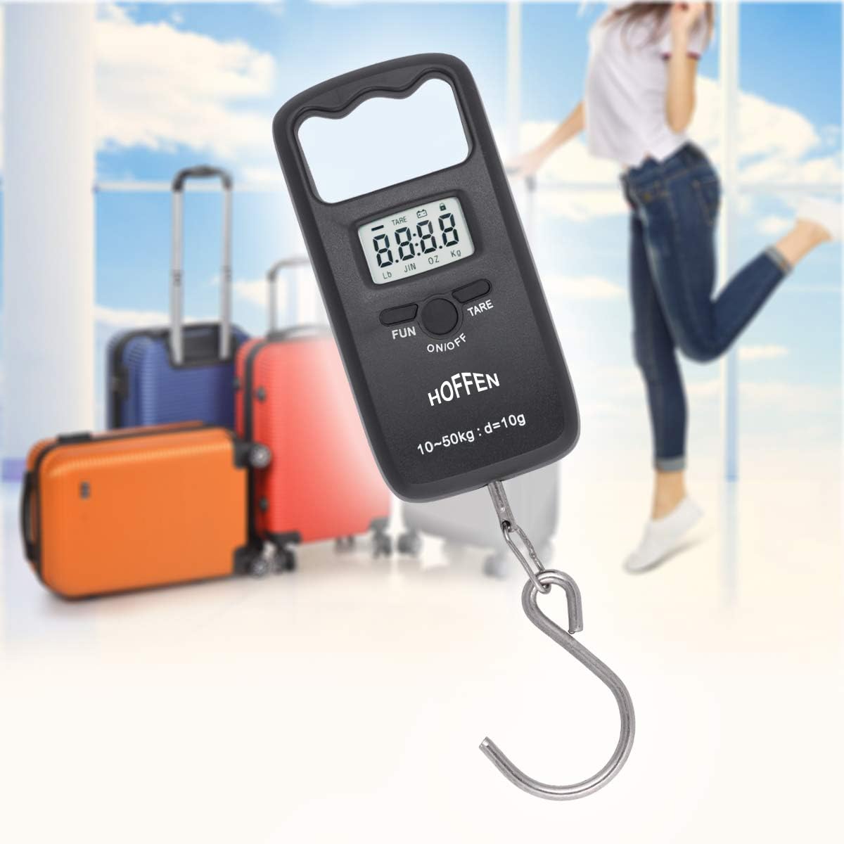 HIGH PRECISION MEASUREMENT : Hoffen weighing machine for luggage Capacity – 50kg, Graduation: 50g Cool Backlight LCD Display – Easy to read in dim light Ergonomic Handle – Provides with a comfort grip when weighing your luggage.