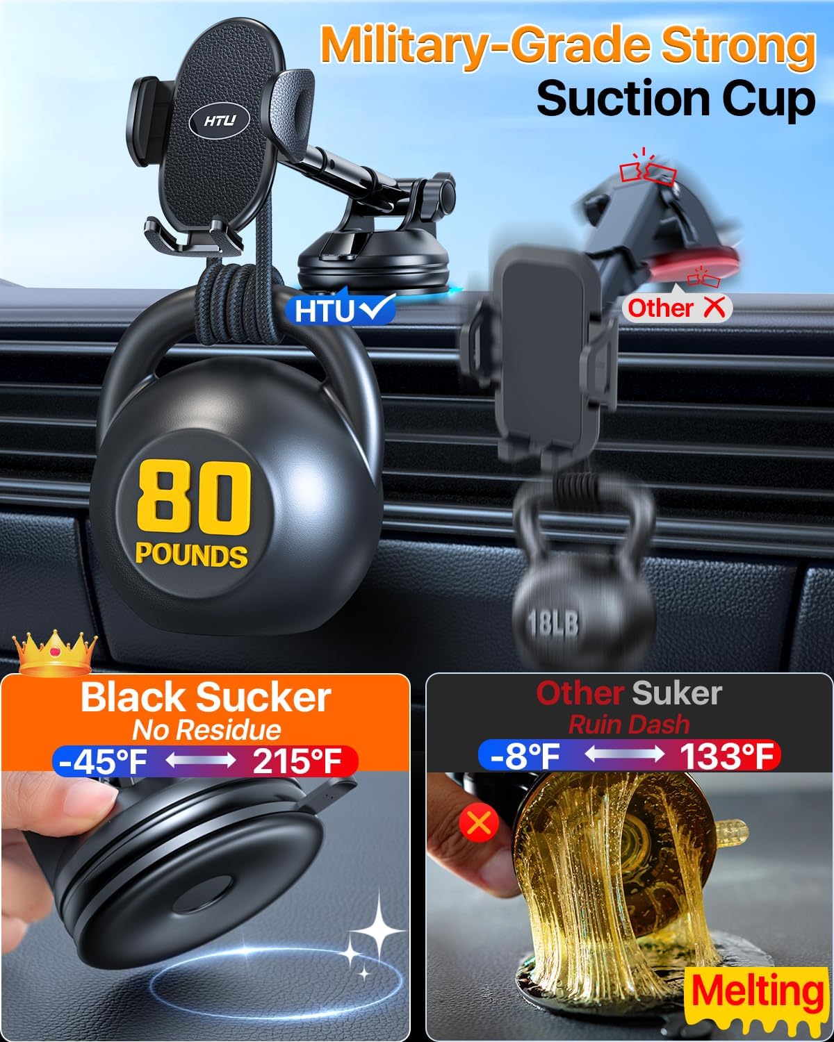 [Powerful Heat-Resistant Adhesion] CP65-certified triple-layer nano gel mount supports 80 lbs & 215℉ extremes. Specifically for off-road, RV & desert use, securing phones rock-solidly for safer drives. 3-step install: Clean surface-Press 15s-Lock. 5X stronger grip vs standard car phone holders