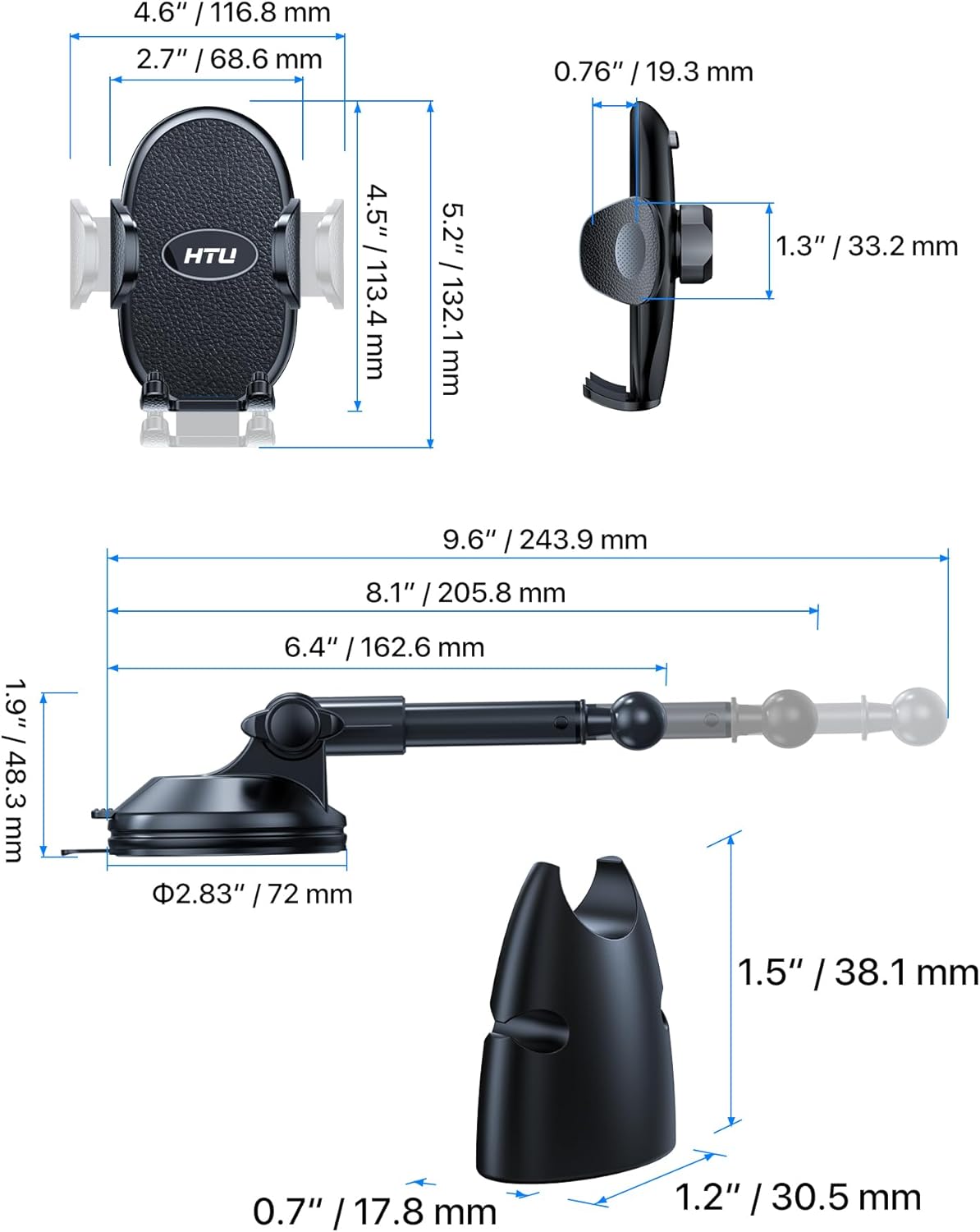 [Easy to Use, 1s Telescoping Arm with No Knob Adjustment] The arm extends from 4.91 to 8.15 inches with no knobs, positioning your phone right in front of you easily. Engineered with innovative aluminum, it locks securely when extended. Includes a cable organizer to prevent car scratches