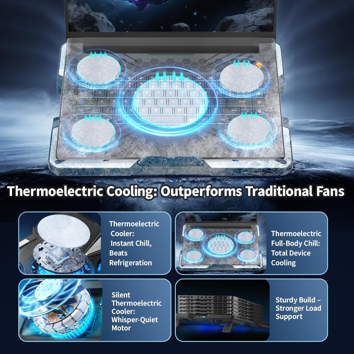 【Rapid Heat Dissipation】 Incorporates Peltier thermoelectric cooling technology + 5-fan design for active thermal management. This dual-cooling system combines intelligent airflow with efficient heat dissipation, delivering improved noise reduction, precise temperature control, and extended service life compared to traditional fan heat sinks.