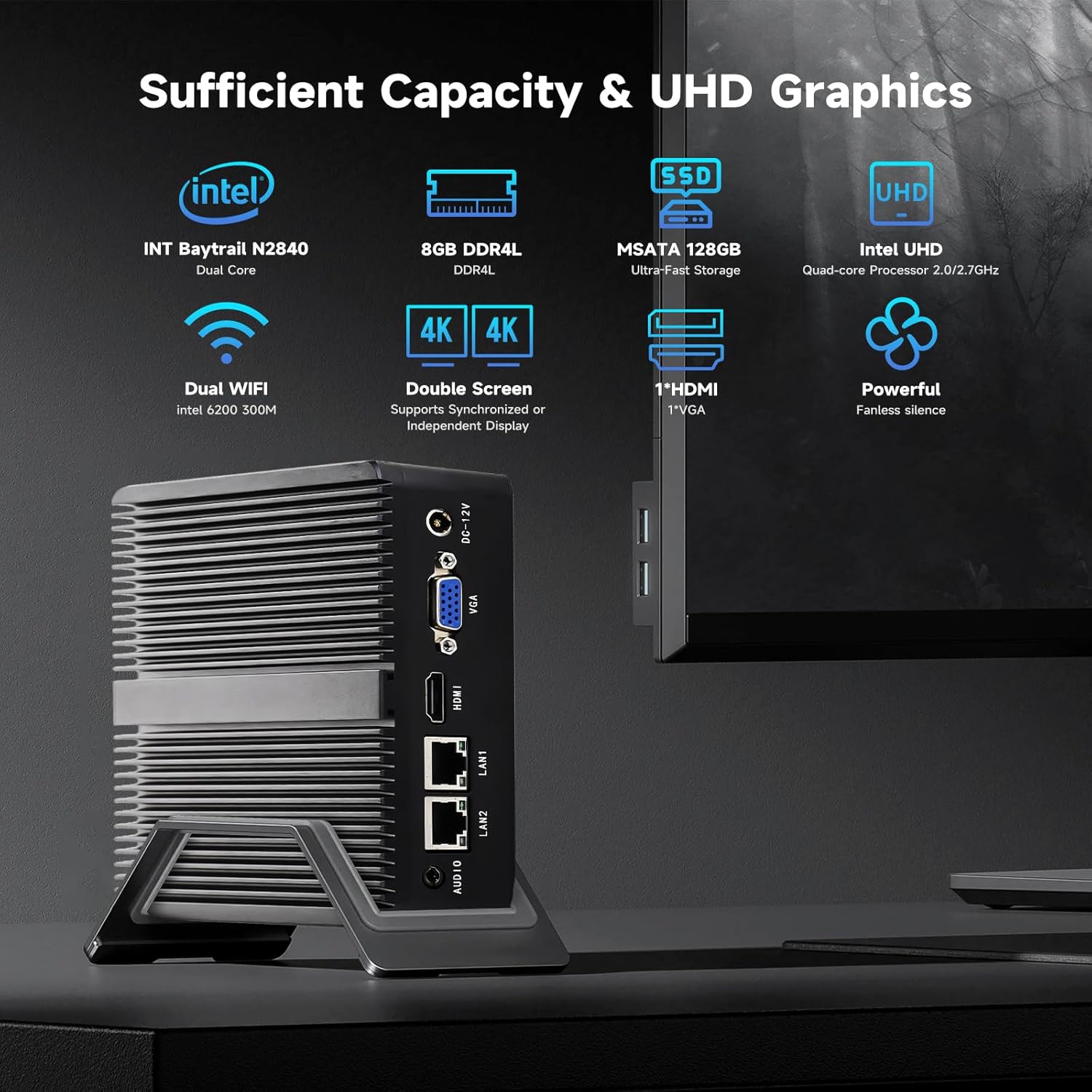 【Sufficient capacity & UHD Graphics】The mini computer N2840 Support 8GB (1*DDR4L/SO-DIMM)DDR3L 128GB. Integrated INT HD Graphics Core GPU. Sufficient capacity allows you to get rid of the trouble in multitasking. Delivers powerful graphics performance double your work efficiency.