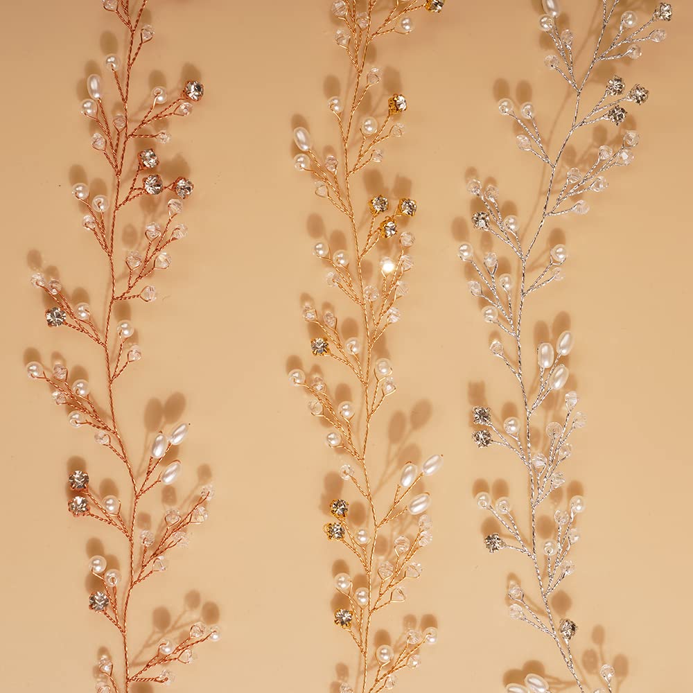 JWICOS Rose Gold Long Wedding Headband Rhinestones Pearl Beads Shining Headpieces for Brides Long Handmade Hair Accessories Hair Vine for Women and Girls (Rose Gold)