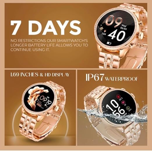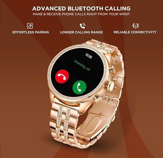 Elegant Rose Gold Design The diamond strap adds a touch of luxury to any outfit, making it a standout fashion accessory.HD Display Quality Enjoy sharp, high-resolution visuals with the smartwatch’s HD display, perfect for apps, notifications, and watch faces.Hands-Free Bluetooth Calling Answer calls directly from your wrist, making it convenient when your phone isn’t easily accessible.Endless Personalization With over 500 watch faces to choose from, your smartwatch will always match your personal style.Flexible Styling Options The two interchangeable straps give you versatility, easily transitioning from day to night or from sporty to elegant.