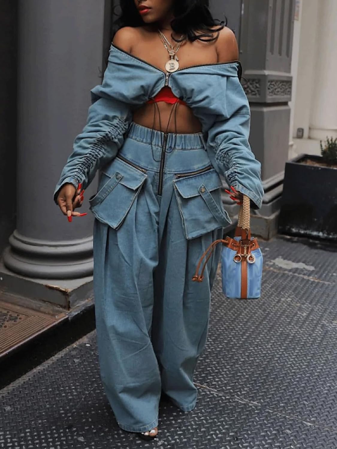 KANSOON Women Denim Set Jean 2 Piece Outfit Cargo Zip Long Sleeve Crop Jacket Wide Leg Pant Drawstring Loose Sweatsuit