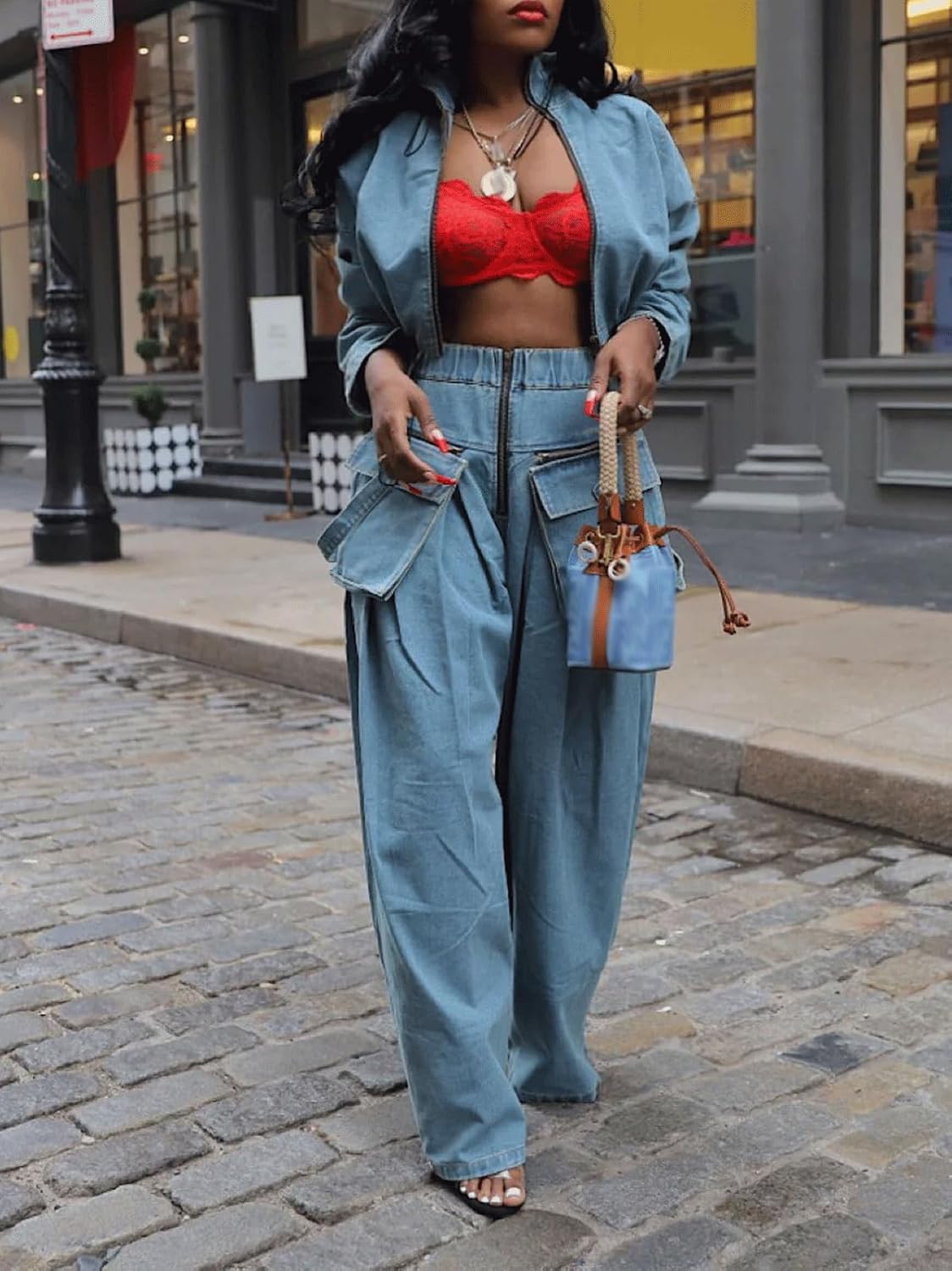 Customers find the denim outfit’s fit true to size, though some mention it runs 2 sizes small. The outfit is chic, with one customer noting that the jacket looks awesome both open and closed. The fabric quality receives positive feedback, with customers describing the denim as great quality.