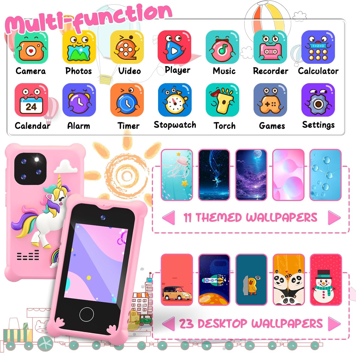 🦄️【Multi-functional Toddler Phone】Upgrade kids play phone comes with more functions include photo capture, video recording, voice recorder, calculator, alarm, torch and so on. 10 touchscreen games, 11 themed wallpapers and 23 desktop wallpapers. Support English, French, Spanish, Portuguese, Italian, German, etc., a total of 12 languages.
