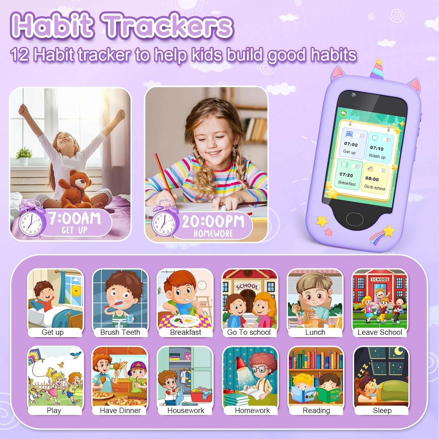 Funny Toddler Education Toy: The phone for kids offers various functions such as A-Z Letter Learning, Habit Tracking, MP3 Player, Games, Bedtime Stories, and Video Recording.It is not only entertaining but also educational, allowing kids to develop their creative side and more feed their curiosity