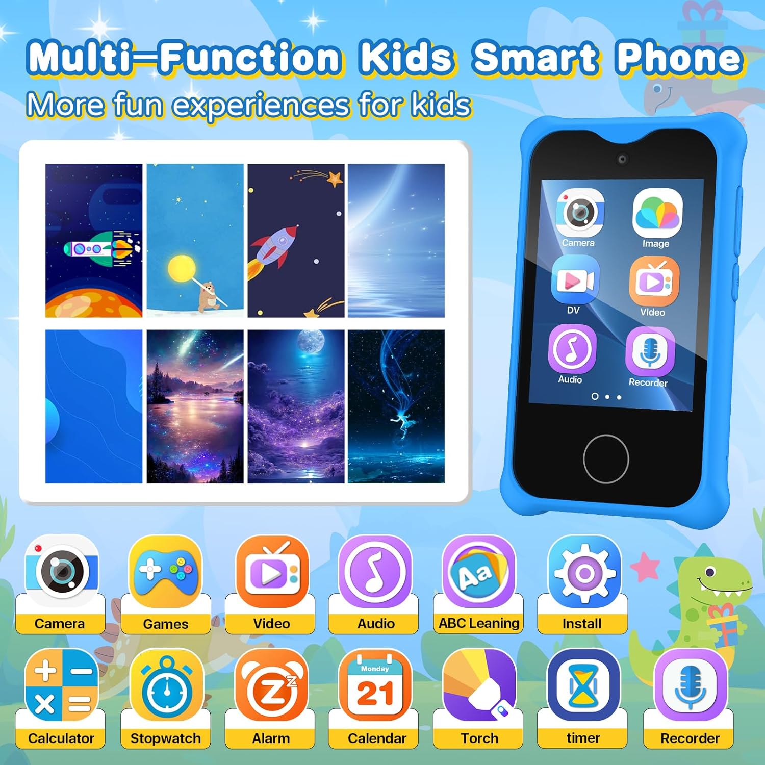 Multi-Functional Kids Smart Phone: kids smart phone has a camera, video, games, learning, music, recording, calculator, alarm clock, stopwatch, timer, flashlight, calendar and other practical functions to meet the needs of all children