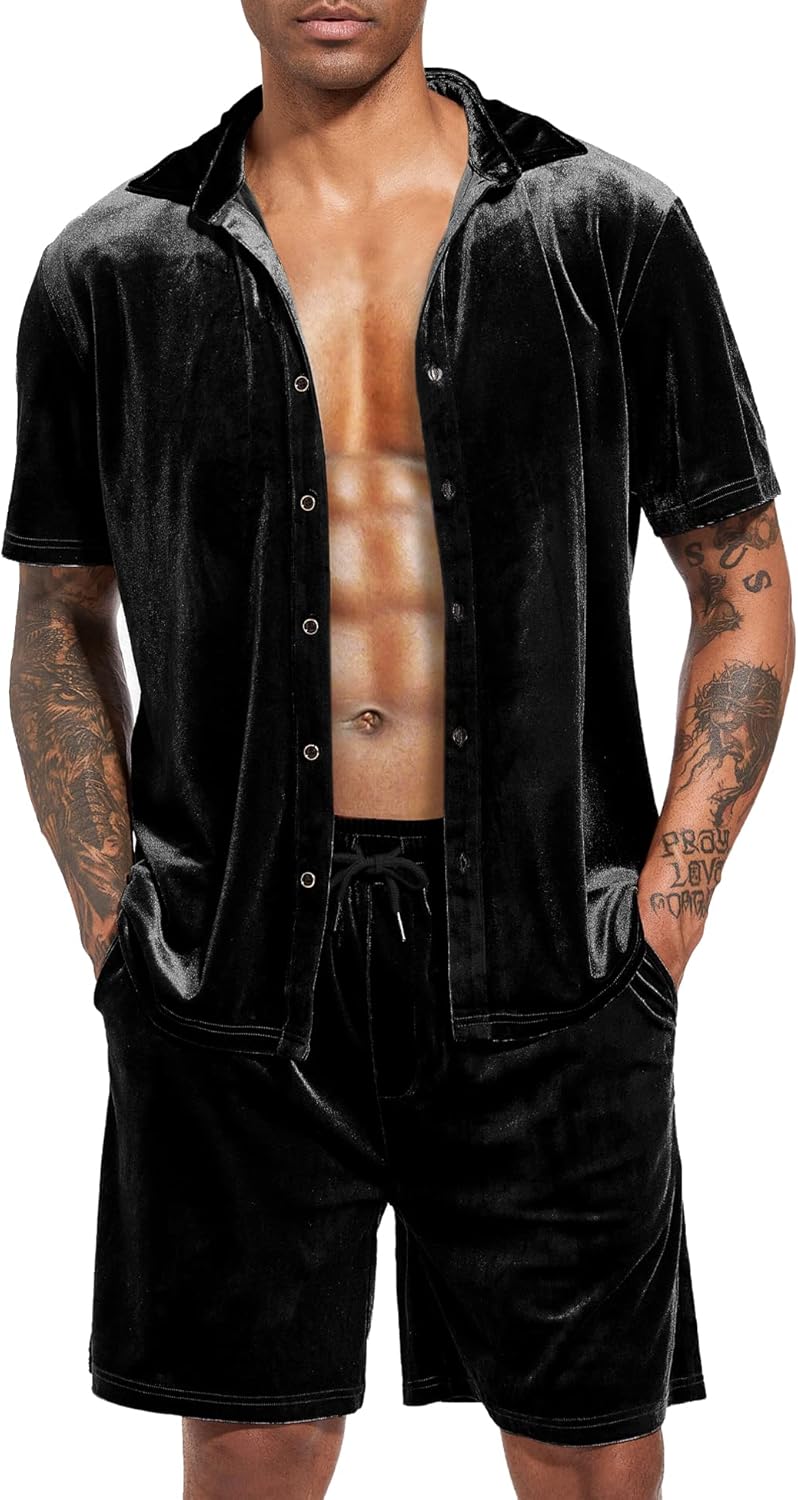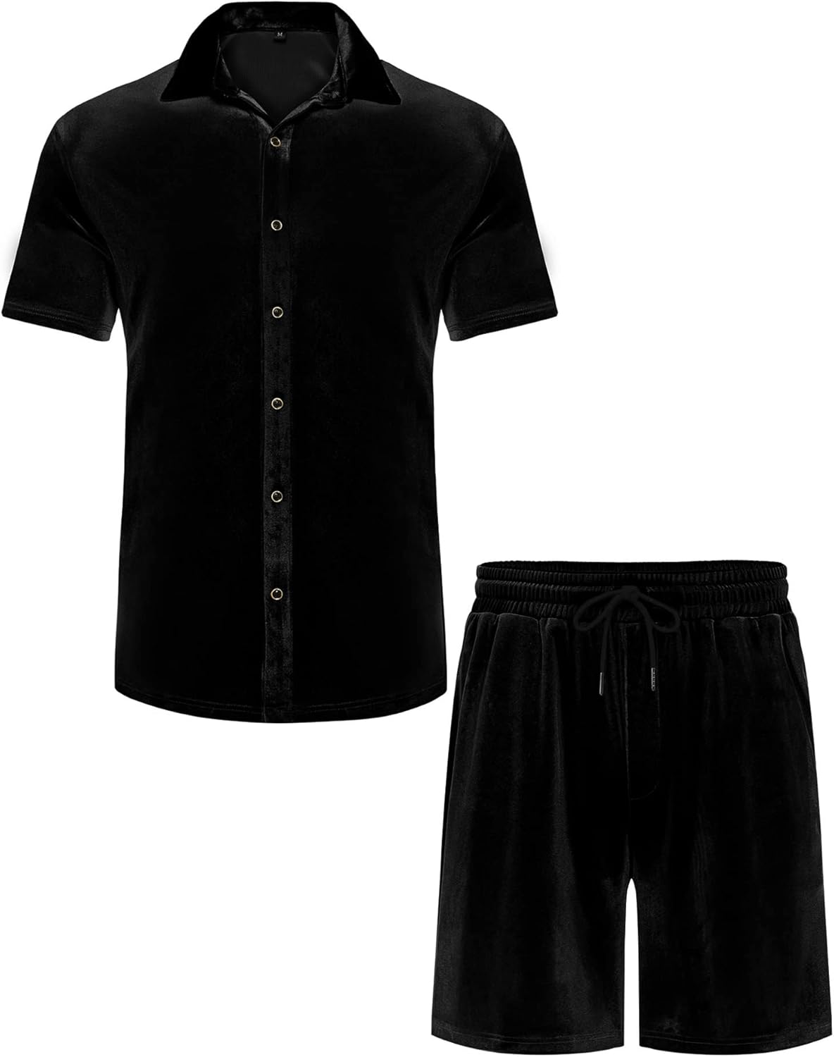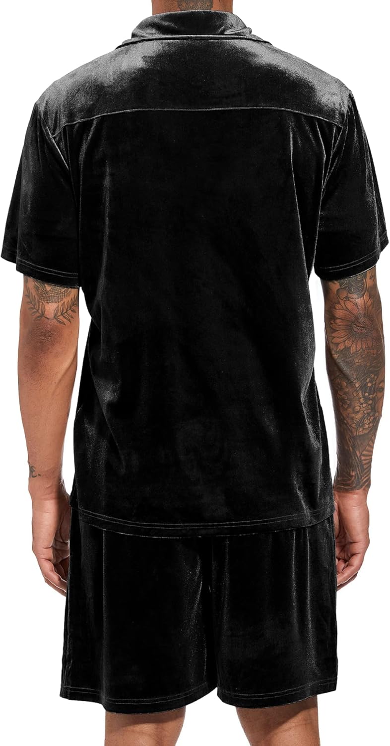 Velvet 2 Piece Set for Men Short Sleeve Button Down Blouse and Shorts Set