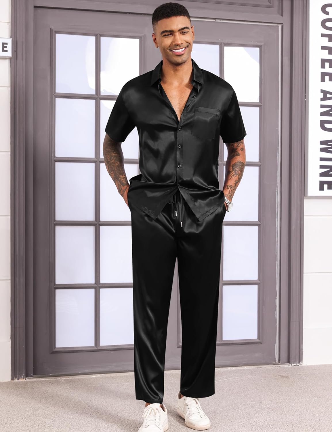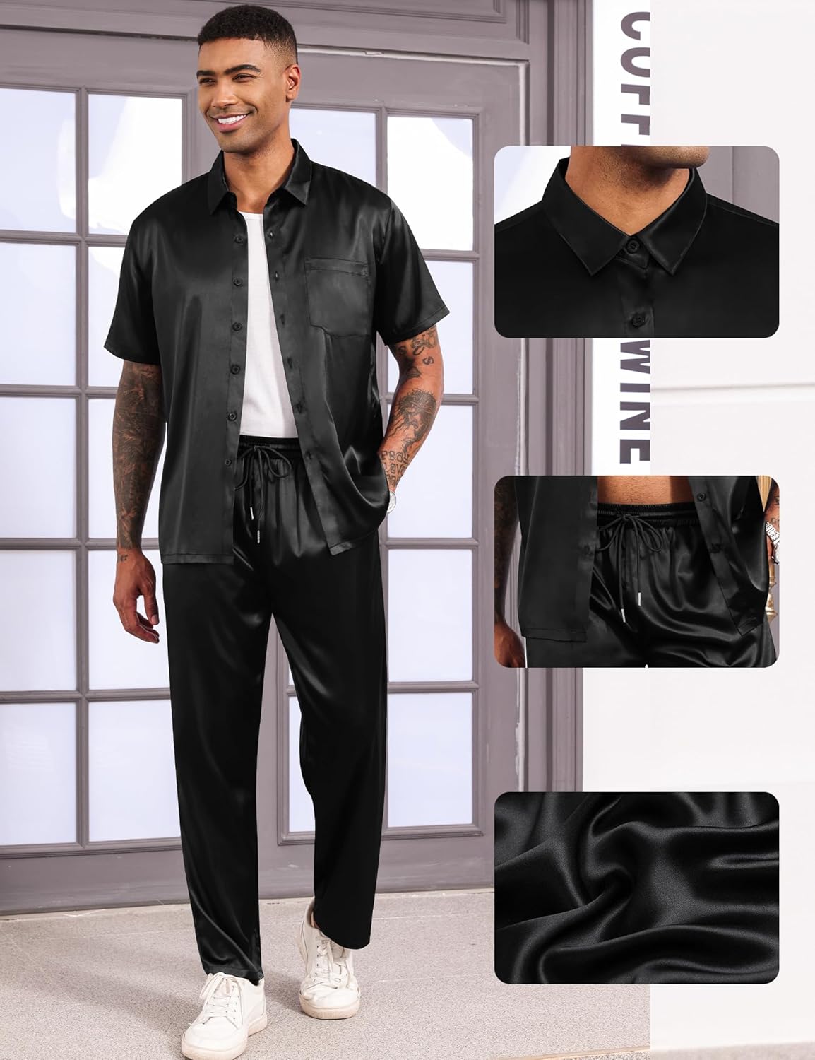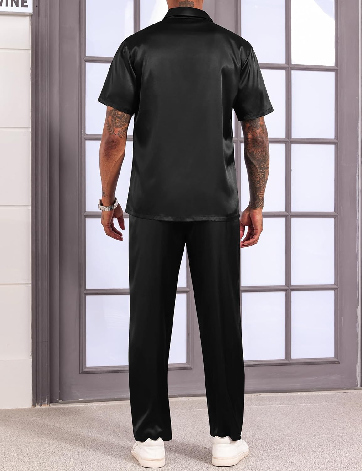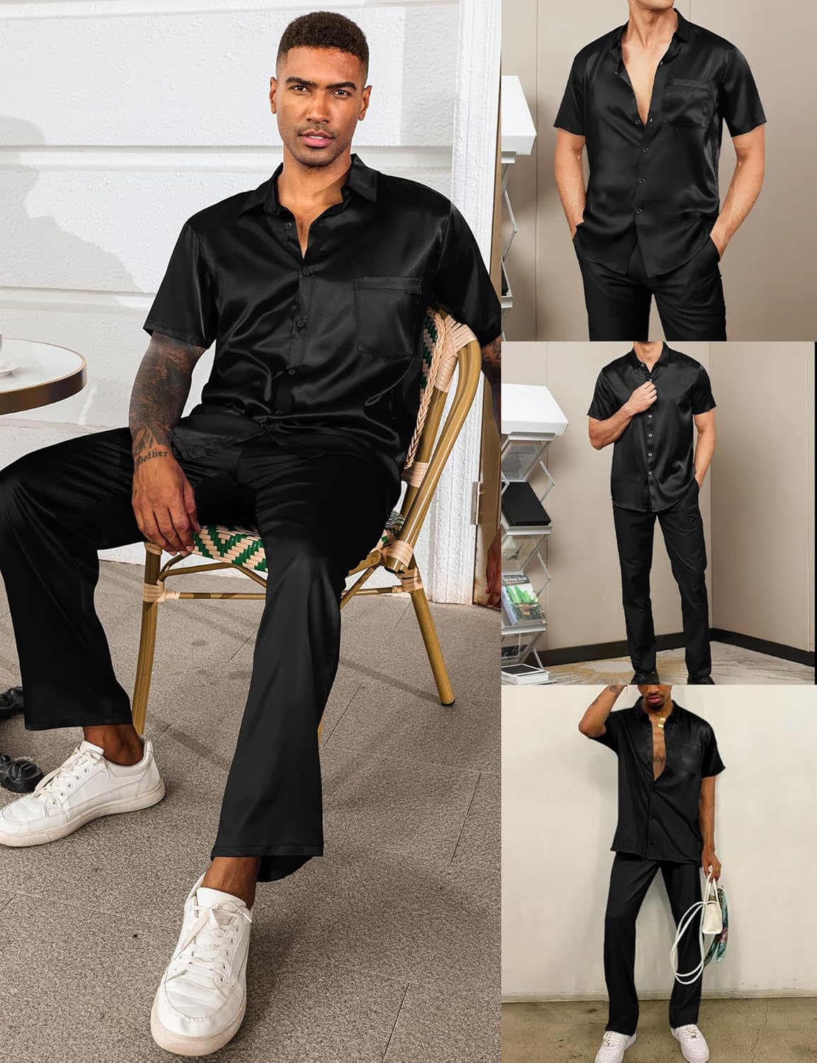 LECGEE Men’s Trendy Satin Short Sleeve Shirt and Pants
