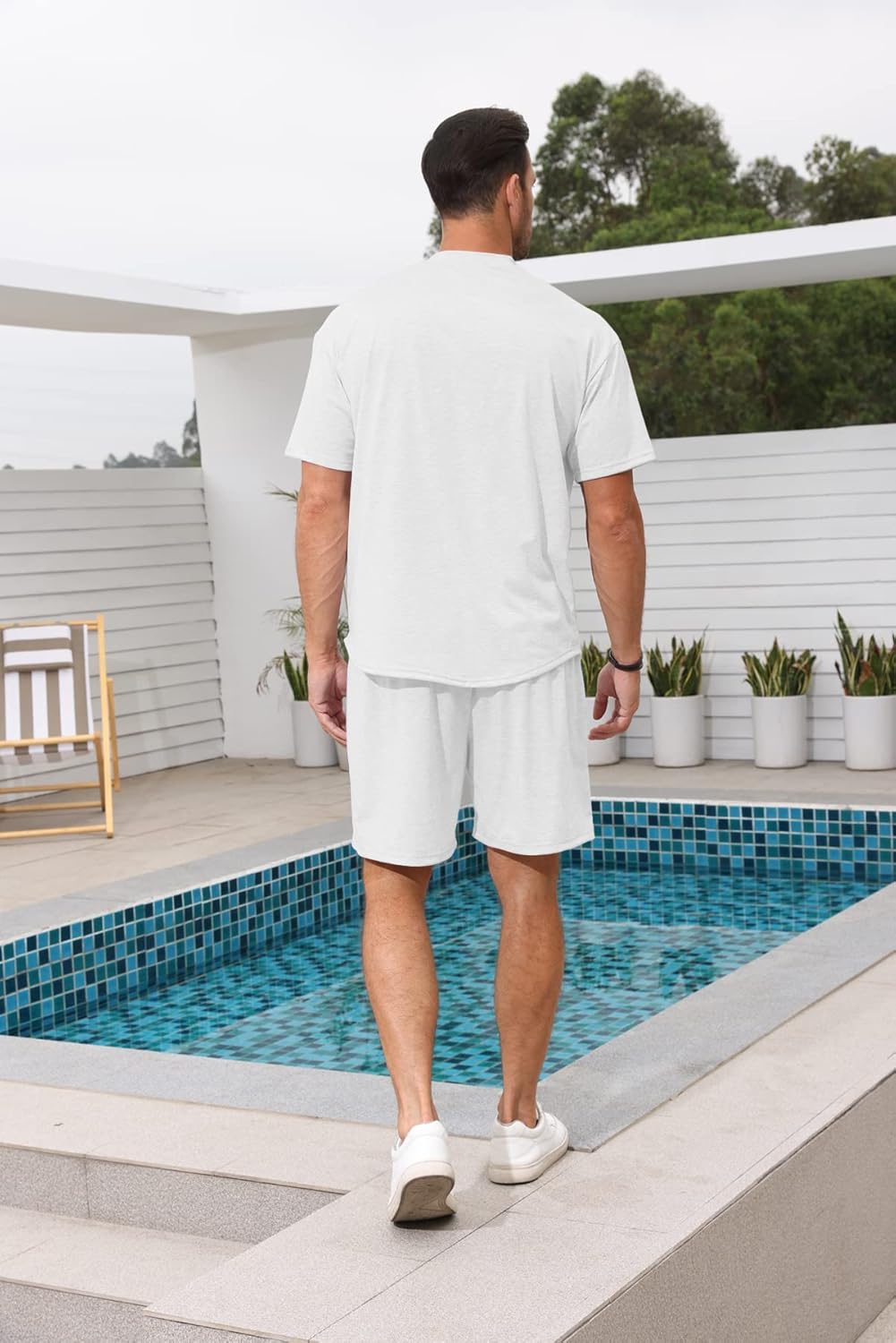 High quality fabric for a lived in feel, the men’s shorts and t shirt set features Soft, Breathable and Stretchy allowing flexible movement through the torso and arms.
