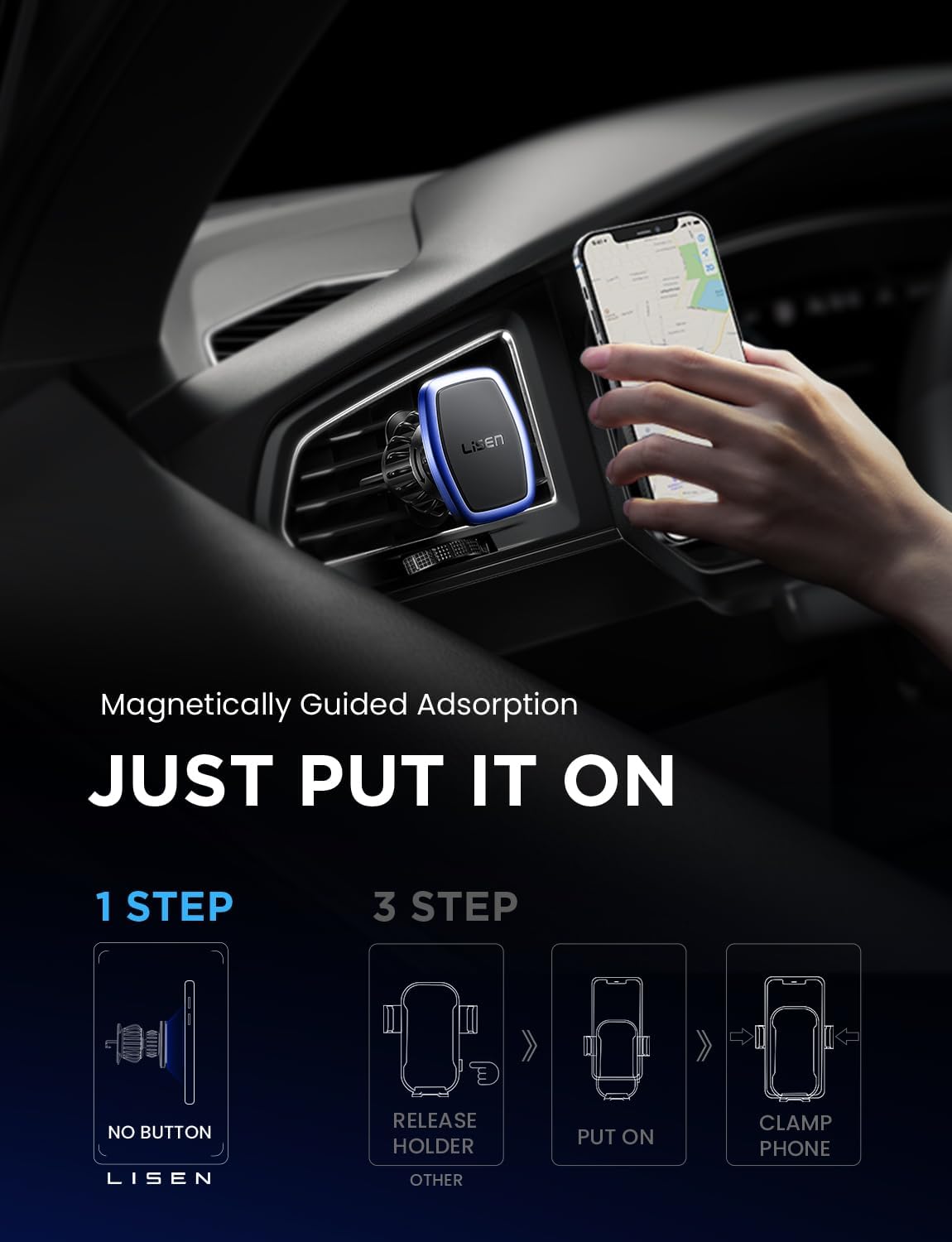 CONVINCING QUALITY & UNIVERSAL COMPATIBILITY: LISEN car phone holder won SGS RoHS & SGS CP65 official certification and passed the magnetic force, telephone signal, hook stability and ingredient safety test. Quality is strictly controlled. The car holder holds most smartphones and mini tablets compatible with iPhone 15 14 13 12 11 pro max / XR / X / 8/7/6/5, Note 9 / Galaxy Note20 U, S24 S23 S22 S21 S20 S10 S9 S8 S7 S6, iPad Air 2 / Mini 3 / Pro 9.7 and more.