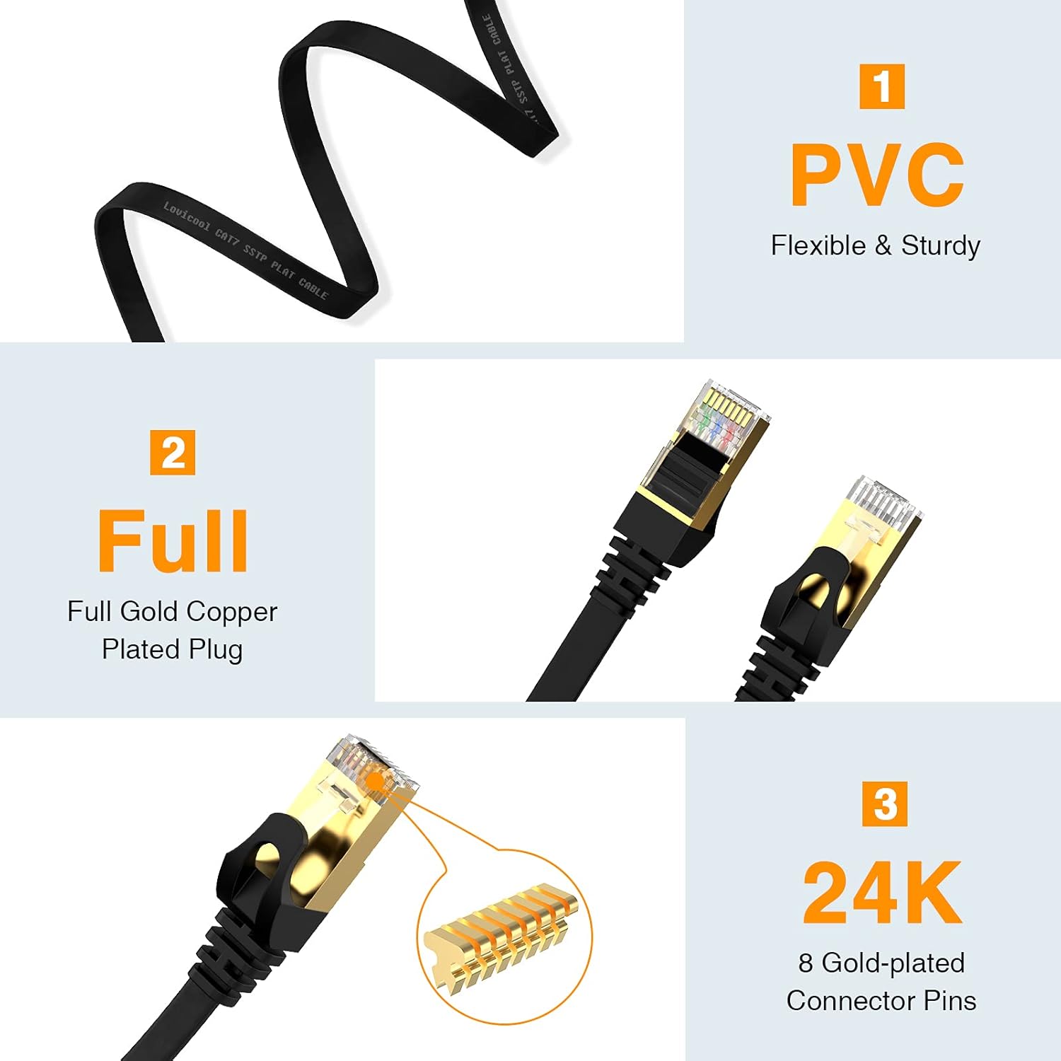 【DURABLE】100% Bare Copper Wire Gold plated RJ45 connectors for reliable data transfer, surrounded by durable PVC jacket. Our lovicool high quality cat7 cable survive different environment, easy to install outdoor and indoor.