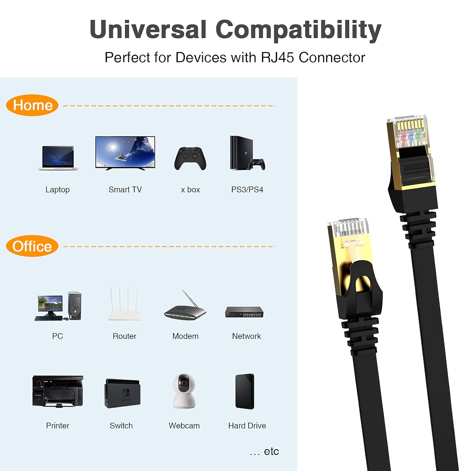 【COMPATIBILITY】Cat 7 Network Cable is compatible with Cat6/Cat5/Cat5e ethernet cable. Provide universal connectivity for Xbox One, Xbox 360, Switches, Routers Modems, PS3, PS4, PS5, Computer, Laptop, Printers, Network Printers, Playstation 5, Network Attached Storage Device, ADSL, NAS, VoIP phones and more