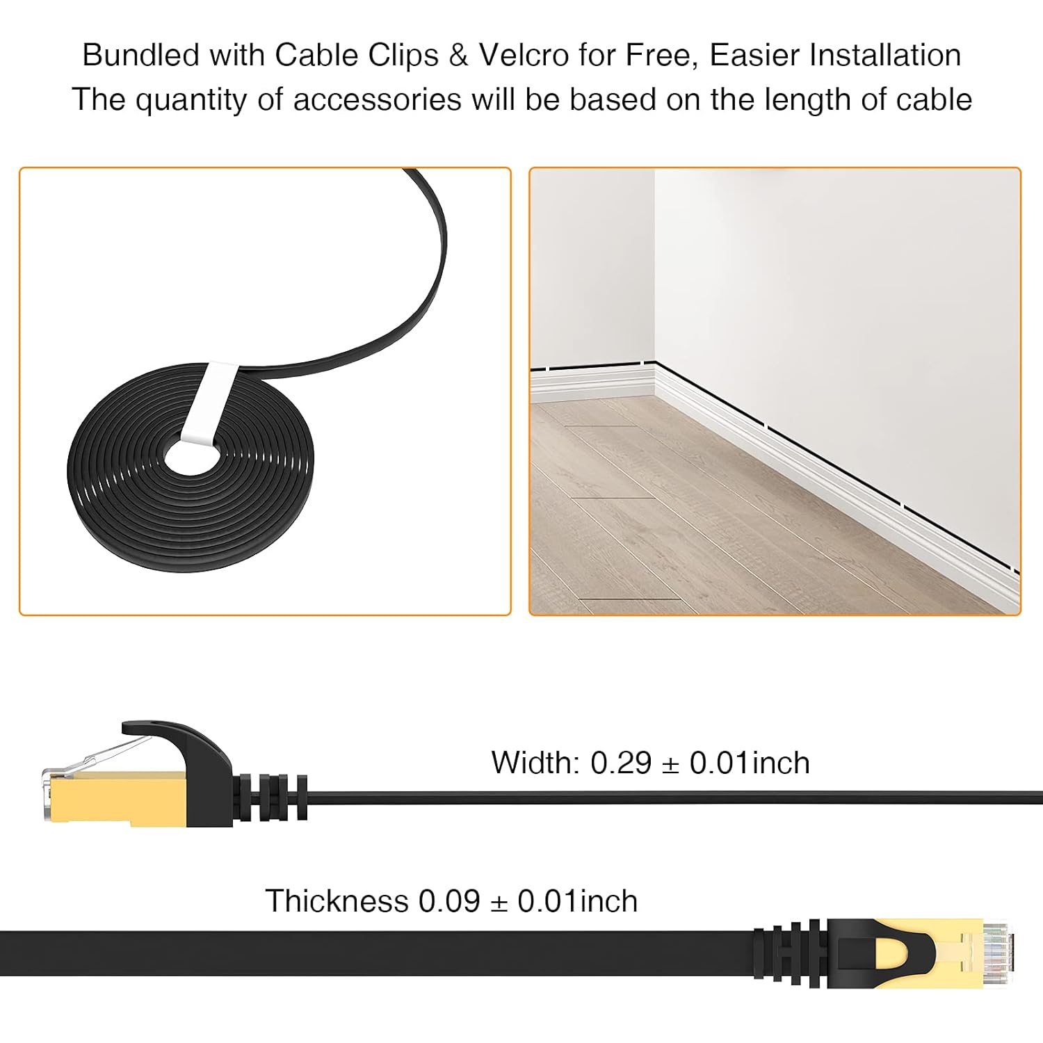 【THIN DESIGN】Flat Ethernet cable is super flexible when run under the carpet or bent in the plane of its thin cross-section such as doors, rotating arms, drawers etc. Also bundled with Clips without worrying about cable mess.