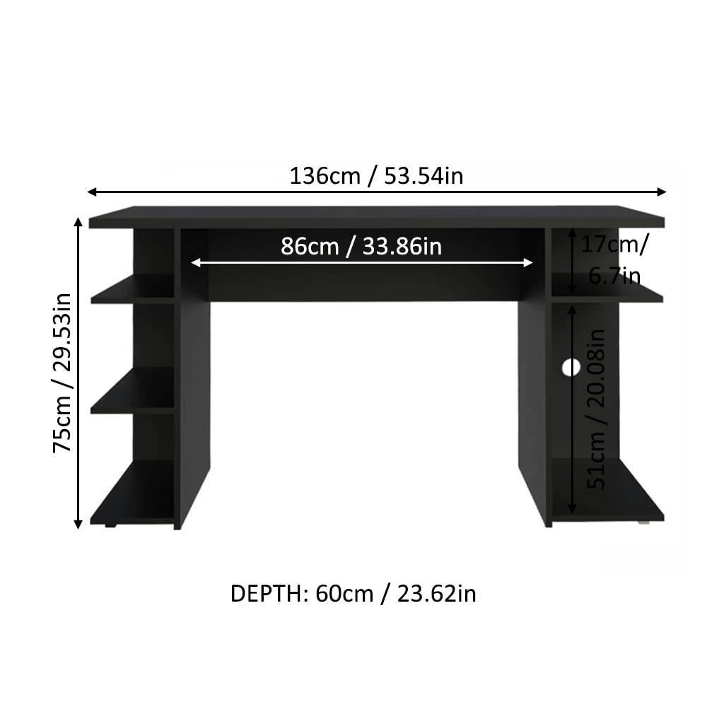 FEATURES: Enough space for multiple monitors, with the 5 storage shelves you can easily organize your gaming stuff, plenty of storage space, this desk has NO paint finish at the back, seven layers of polyester paint protection and supports up to 50 Kg