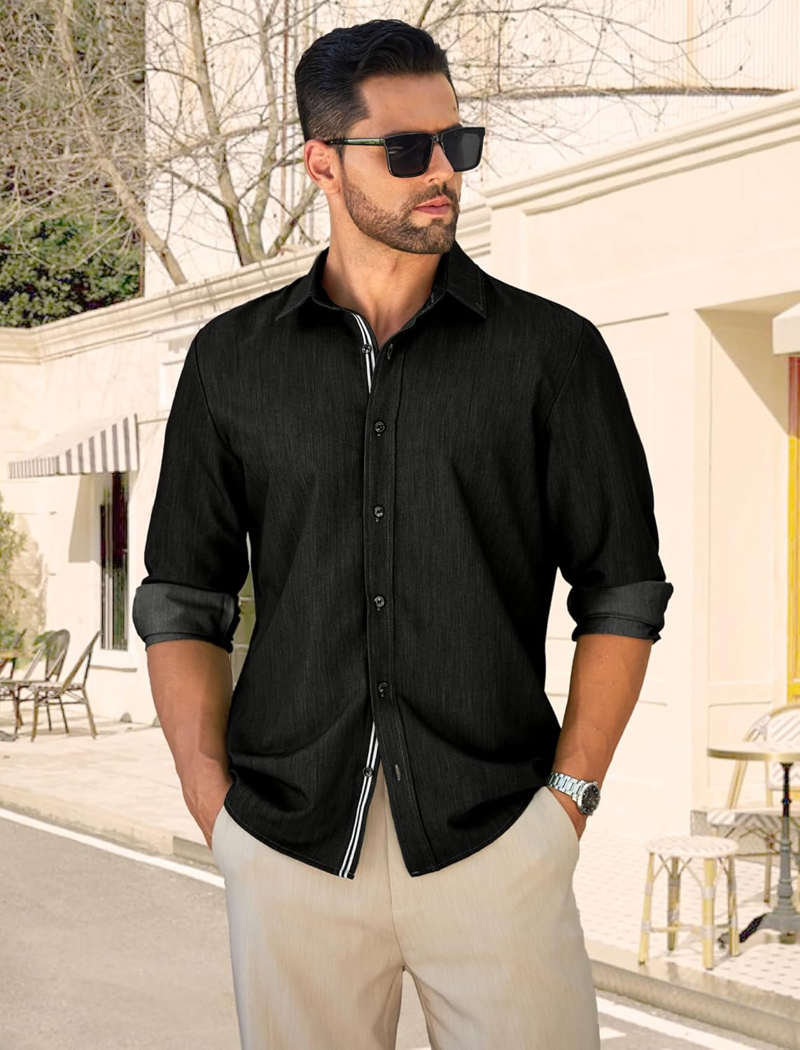 MAPICK Mens Casual Button Down Shirt Long Sleeve Stretch Denim Dress Shirt