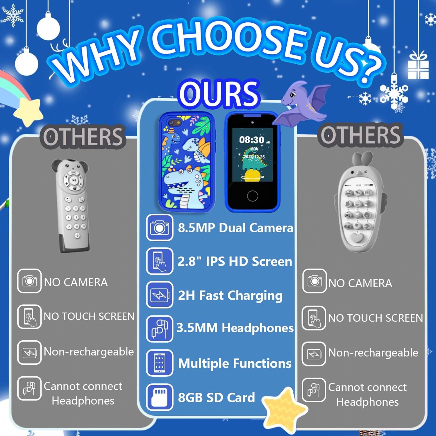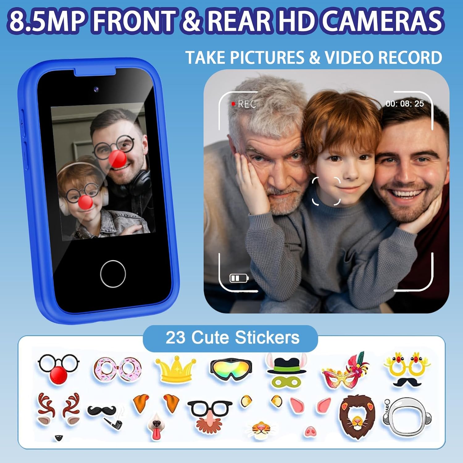 Dual Cameras Kids Phones & Fun Sharer: Share the fun in your child’s eyes through the kids phone camera, understand your child’s inner world and strengthen the connection between parents and children. This toys for boys aged 3-8 is equipped with dual cameras and 23 cartoon stickers, allowing children to take some interesting photos with family or friends