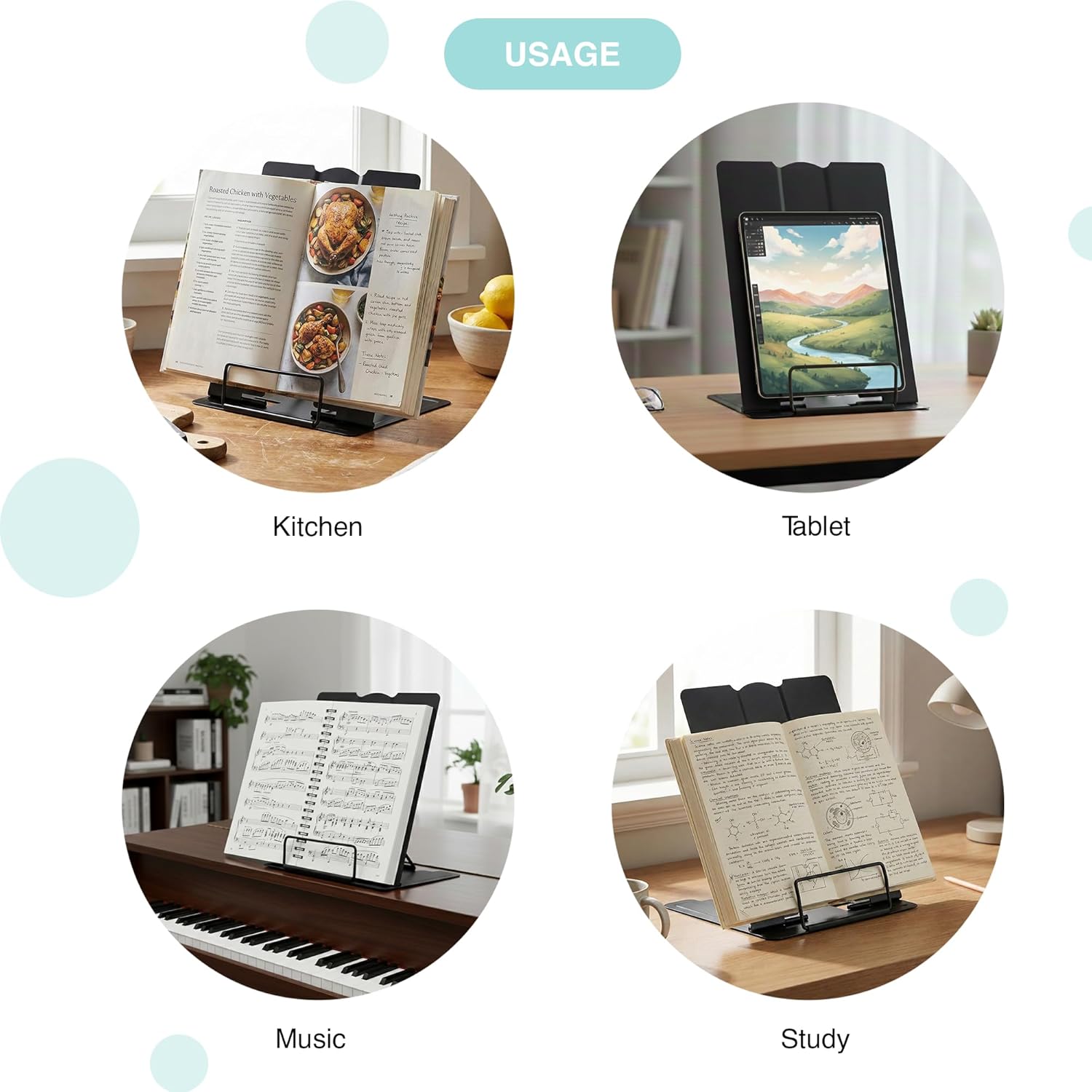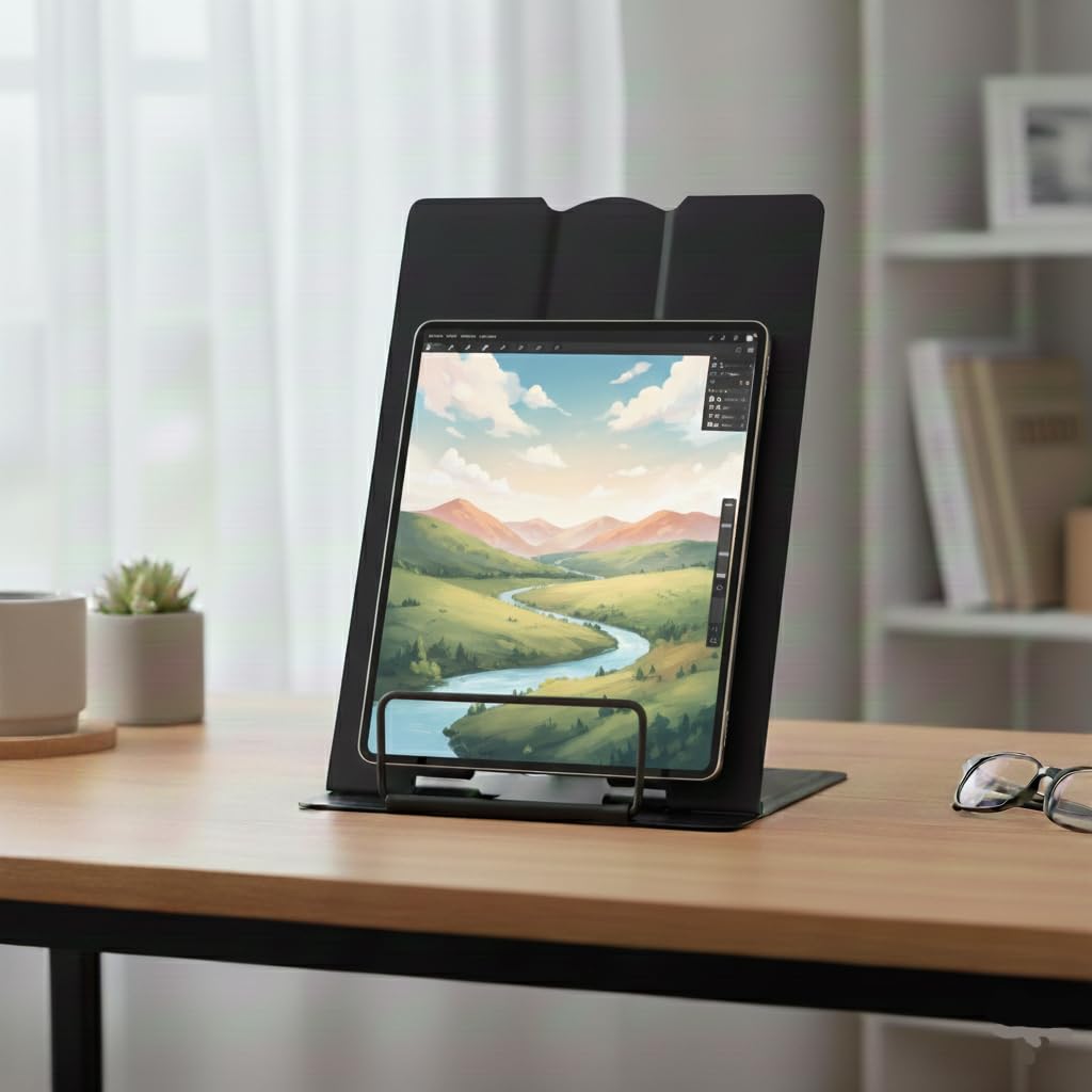 Versatile reading stand for multiple purposes – as a book reader, tablet holder, cookbook / recipe book holder, prayer book holder, textbook stand, music paper holder etc.