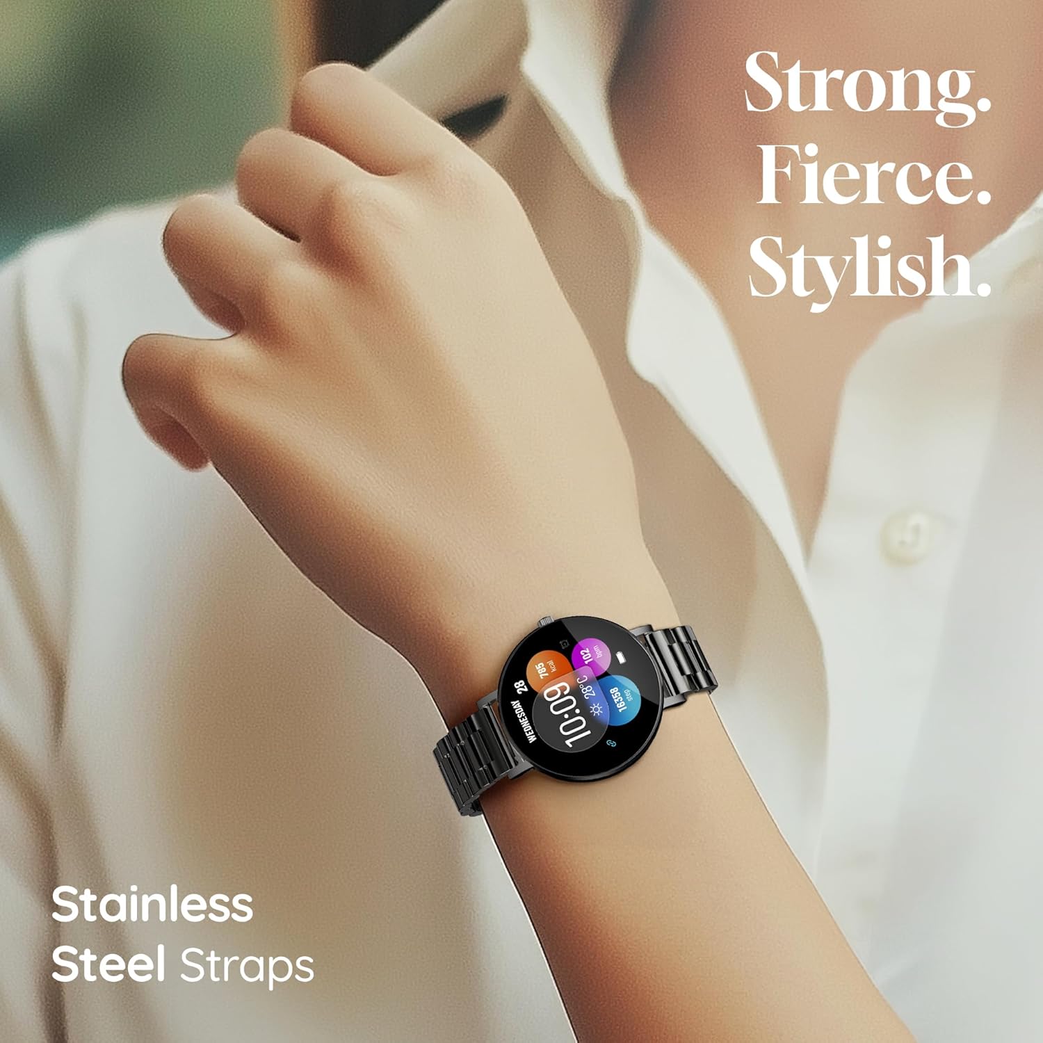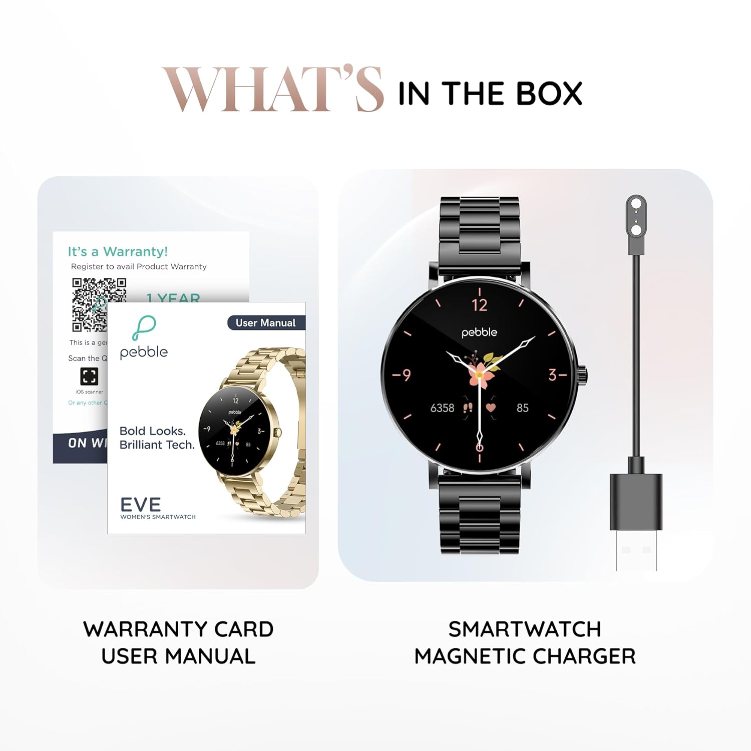 Pebble Eve 1.19” Ultra AMOLED Smartwatch 700 Nits, Bluetooth Calling Smart Watch for Women, Female Health Tracker, Stainless Steel Strap, IP67, DIY Faces, Smart Sensors, BT 5.3 – Classic Black