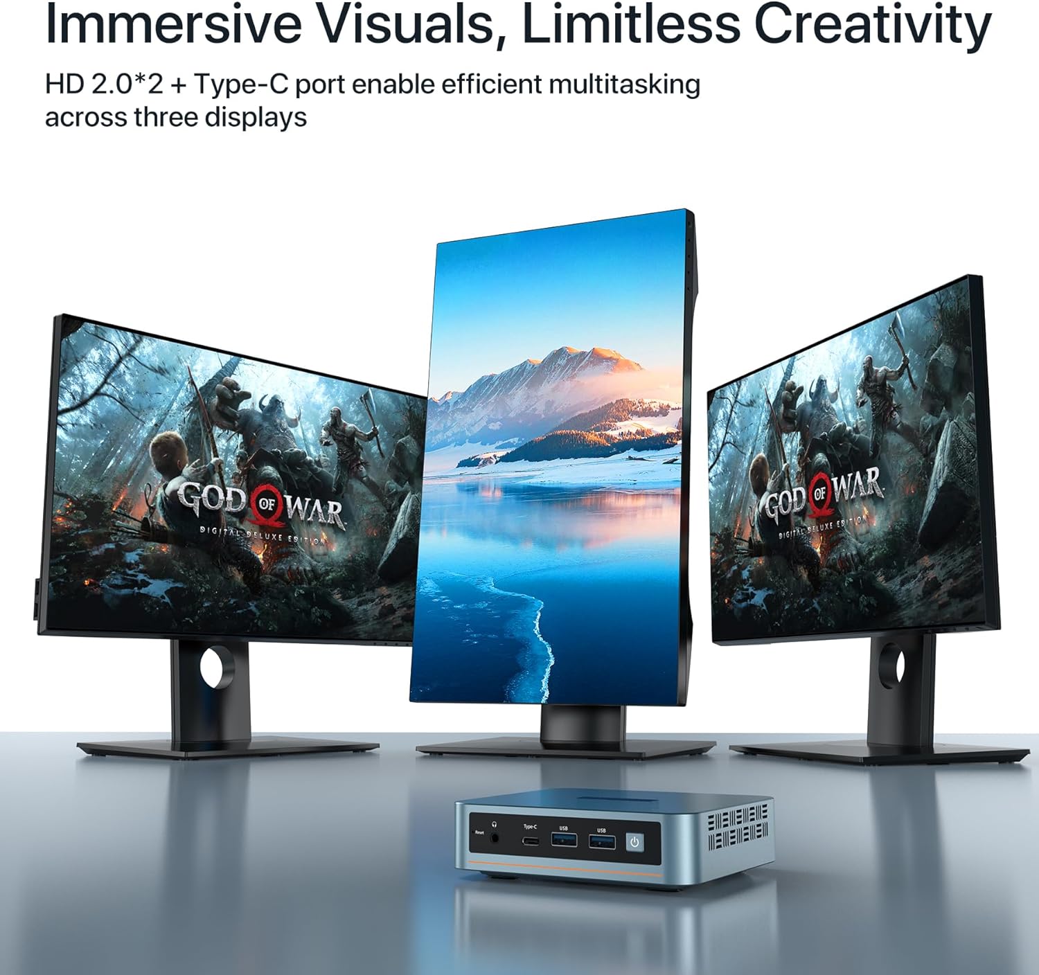 【Triple-display & 4K/60Hz UHD Video Output】This small pc has Intel UHD Graphics that frequency is supports 4K 60Hz triple screen display.It can support up to three 4K displays via HD port, Type-C, without any limitation on the combination used. Easy to enjoy Web surfing, or connect to your projector as a home theatre, enjoy a variety of entertainment.