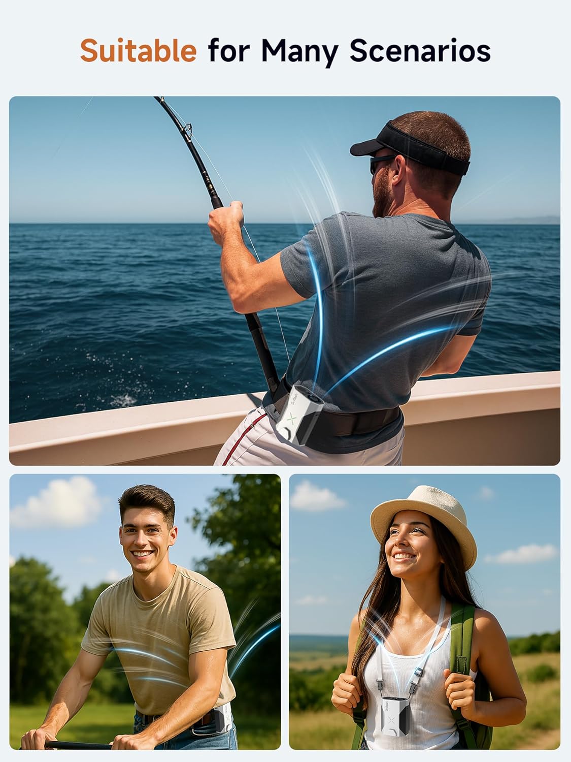2 in 1 Multifunctional Waist Clip Fan:an integrated waist clip fan,handheld fan , and neck fan. You can clip this belt fan to your shirts, belt, or pants, or you can hang the personal fan around your neck with the lanyard
