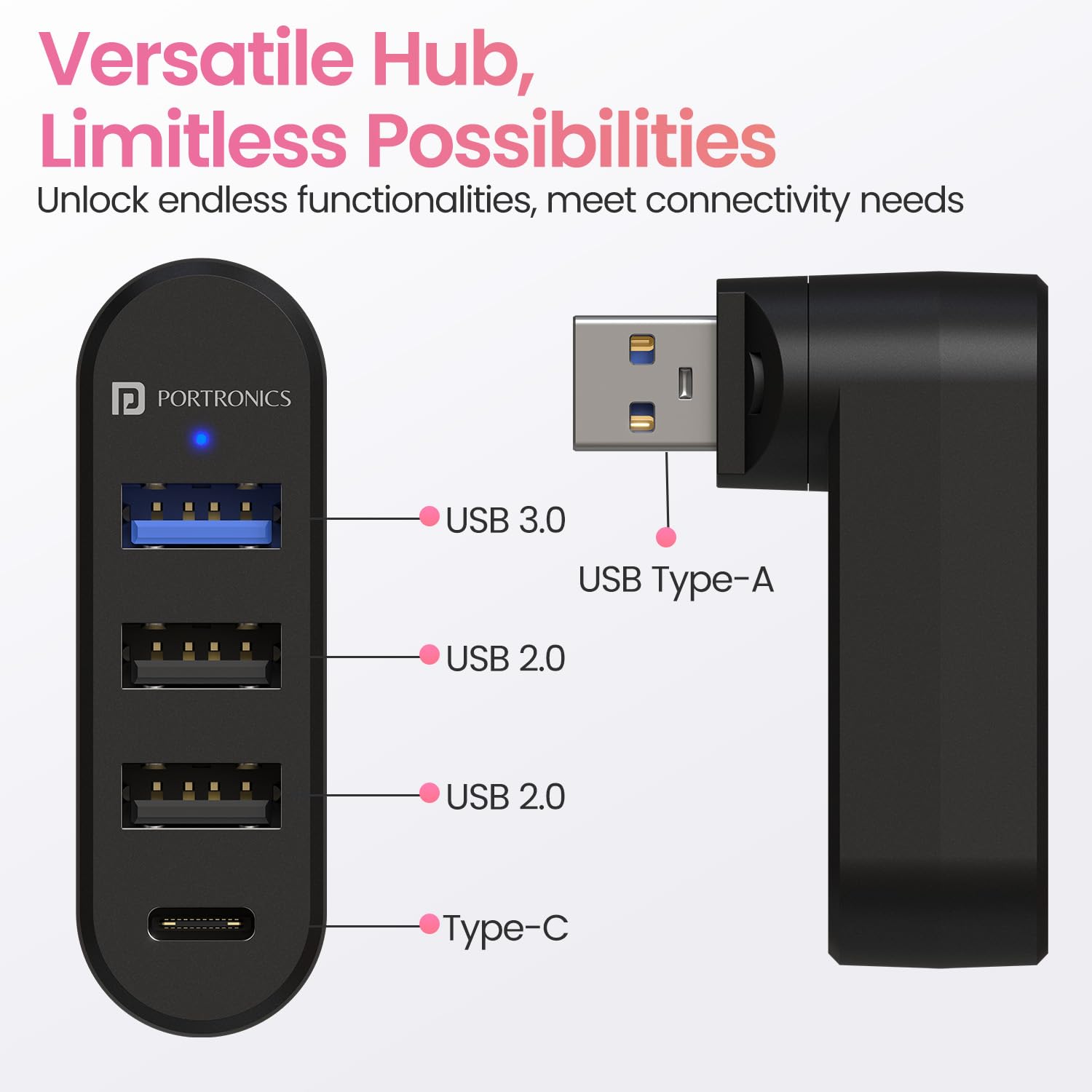 Portronics MPort Spin 4-in-1 USB Hub Dock with Type-C, USB 3.0 SuperSpeed, Rotating USB Plug, 2-Port USB 2.0 High-Speed, for Laptop, PC (Black)