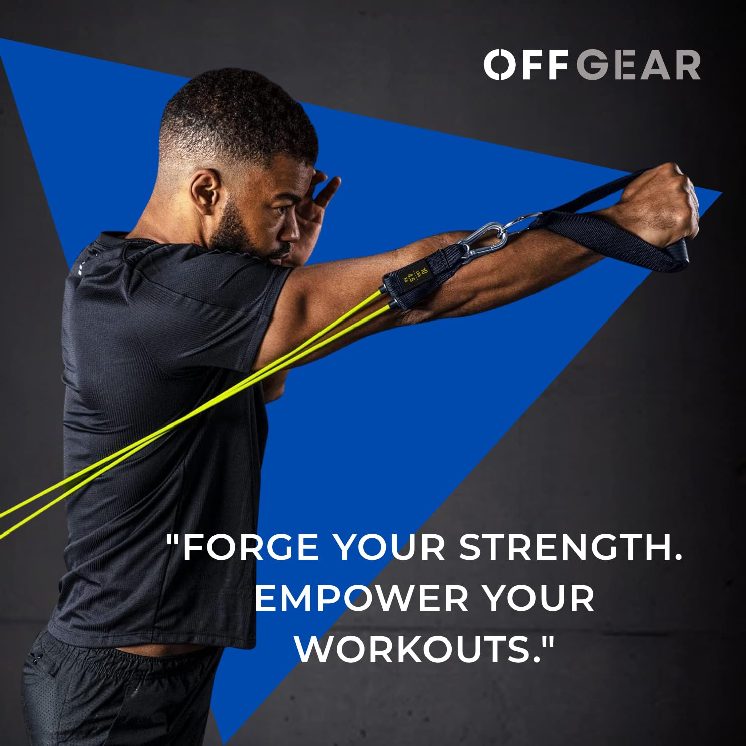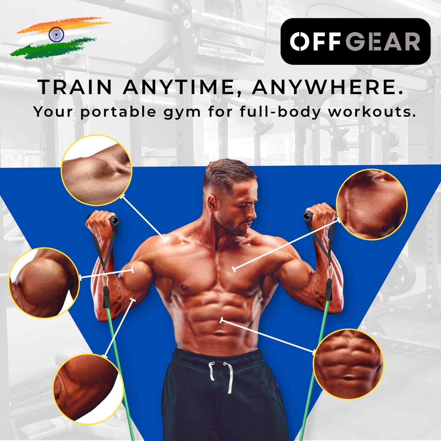 Key Features: Comprehensive Set: Includes 5 color-coded resistance bands, 2 Anti – slip handles, 2 ankle straps, 1 door anchor, Exercise guide & a waterproof carry bag. Customizable Resistance: Each band offers a different resistance level, allowing you to combine them for a customized workout intensity up to 100 lbs. Durable Material: Made from high-quality natural latex, ensuring longevity and consistent performance. Versatile Workouts: Ideal for strength training, muscle toning, physical therapy, yoga, and more. Portable Design: Lightweight and compact, making it easy to carry and store, so you never miss a workout. 🇮🇳 MADE IN INDIA, MADE WITH PRIDE Why Choose This Set? This resistance band set is perfect for individuals of all fitness levels. Whether you’re a beginner or an experienced athlete, the adjustable resistance levels and comprehensive accessories provide a full-body workout experience. The durable construction ensures safety and reliability, while the portable design allows you to maintain your fitness routine wherever you are.