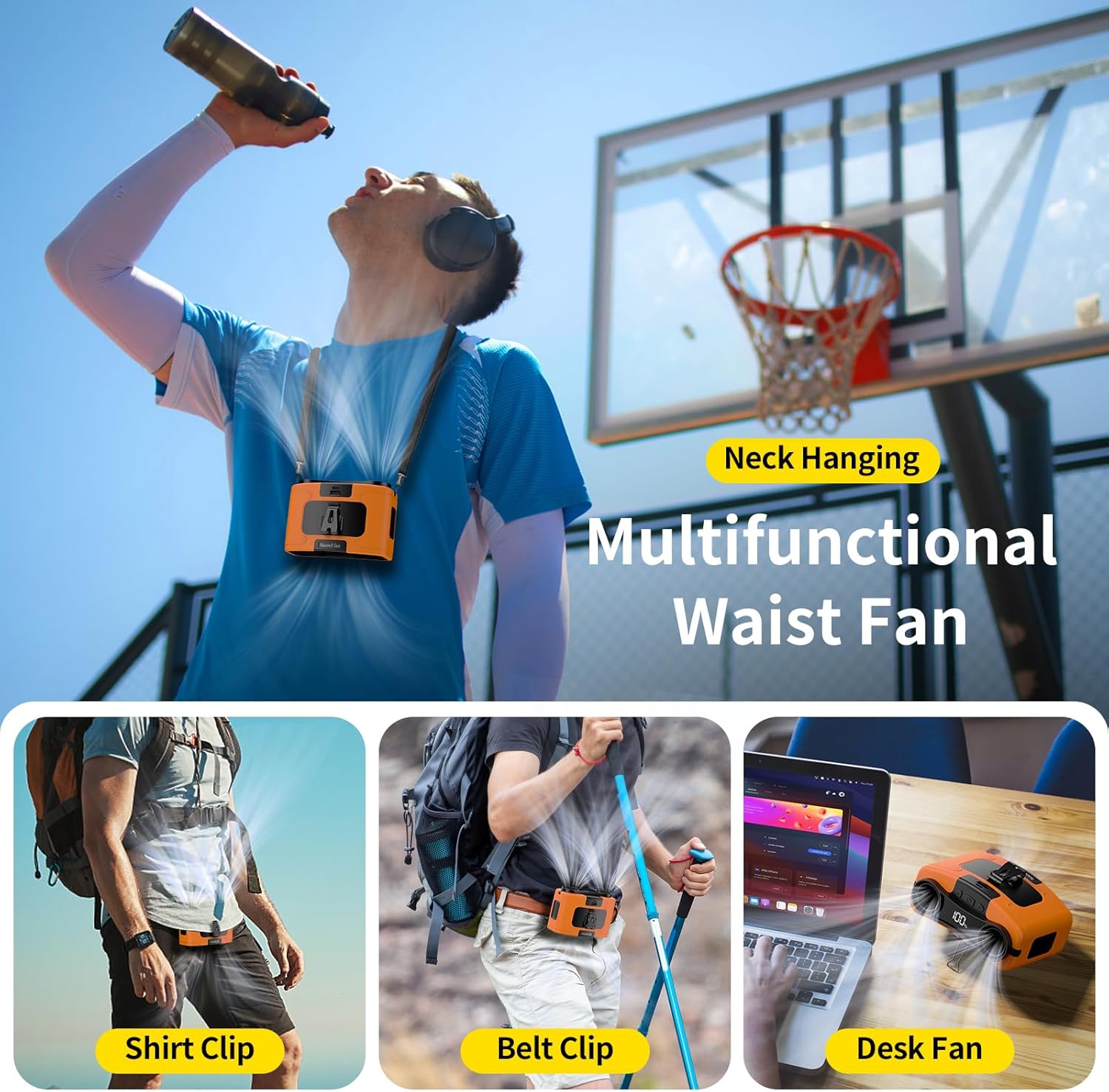 【5-in-1 Multifunctional Waist Clip Fan】A Portable fan serves as a waist clip fan, neck fan, desk fan, and handheld fan. The Personal fan can be clipped onto clothes, shirts, and pants, worn around the neck, or propped up on a table for hands-free use