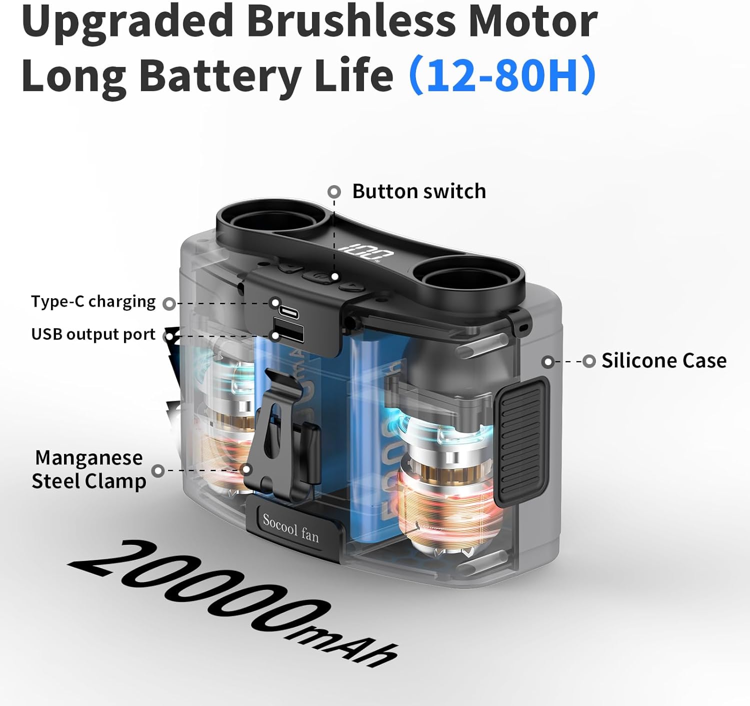 Socool 20000mAh Portable Waist Fan Clip on Wearable Belt Personal Fan Rechargeable Battery Operated, 40H Cooling Fan with 10 Speeds & Dual Motors,Neck Hanging Hands-Free For Outdoor Travel Power bank
