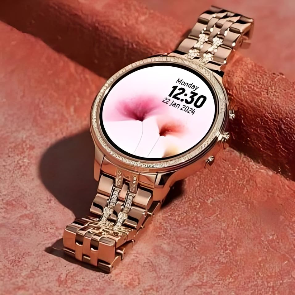 ✅DISPLAY & DURABILITY: Super AMOLED screen with crystal-clear visibility in all lighting conditions, complemented by waterproof construction. Featuring a Beautiful Golden Round Dial with Diamond Accents, This Smartwatch Offers a Fancy and Elegant Look for Women.