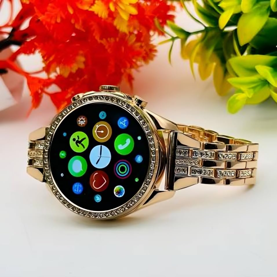 ☑️Featuring a Beautiful Golden Round Dial with Diamond Accents, This Smartwatch Offers a Fancy and Elegant Look for Women.