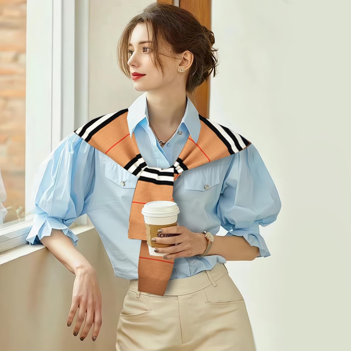 This is a sweater cape, a must-have fashion item for spring, summer, and autumn. The layered combination highlights a three-dimensional look and makes it unique. It is essential for both decoration and keeping the shoulders and neck warm in an air-conditioned room. It can be used indoors, when going out on the street, and in other situations.
