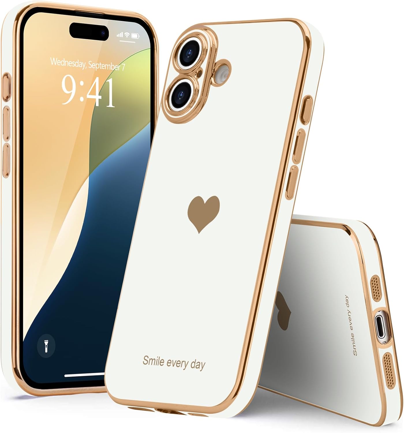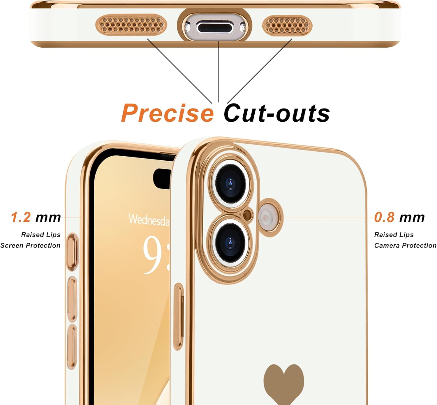 Teageo for iPhone 16 Case with Screen Protector [2 Pack] Girl Women Cute Girly Love-Heart Luxury Gold Soft Cover Camera Protection Silicone Shockproof Phone Case for iPhone 16, White