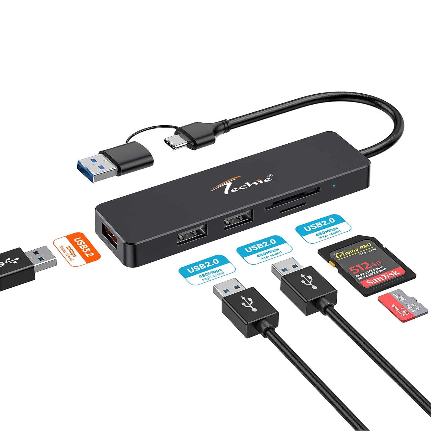 Techie USB-C to USB-A 3.2 Hub with 2× USB 2.0 Ports and SD/TF Card Reader Dual Input Adapter for MacBook, iPad Pro, Windows, Laptops and Tablets (Black)