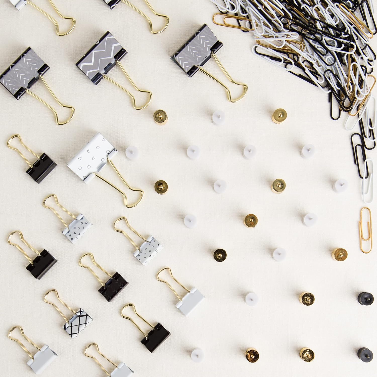 Express your personal style and bring a bit of luxury to your workspace with these eye-catching black, white and gold clips and thumbtacks