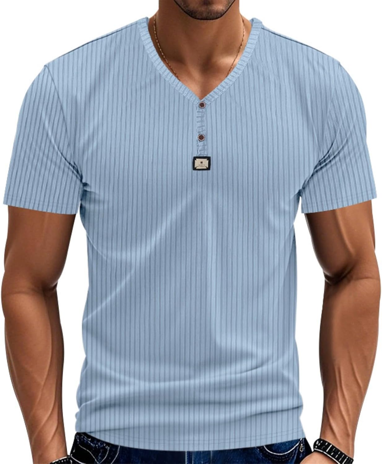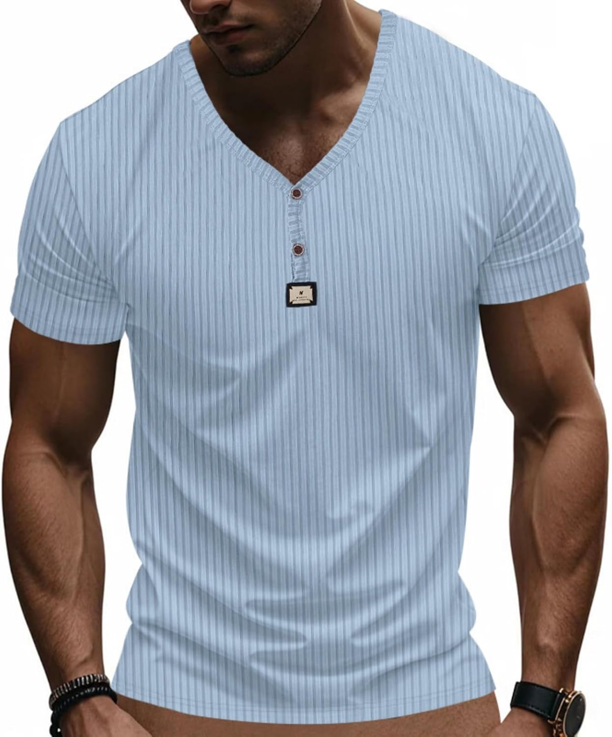 Upgrade your summer wardrobe with this Men’s Casual Slim Fit V-Neck Short Sleeve Button T-Shirt, for comfort and style.