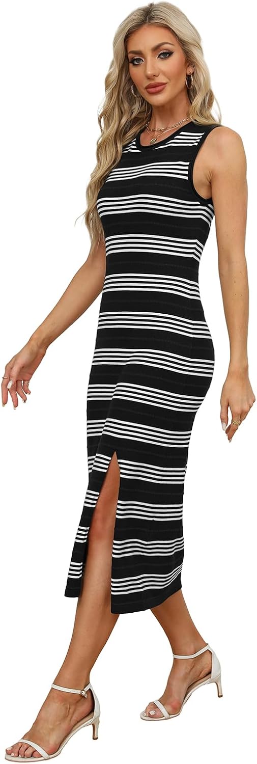 WIHOLL Womens Bodycon Summer Casual Midi Sundress Sleeveless Cute Hollow Out Knit Side Slit Striped Long Tank Dress