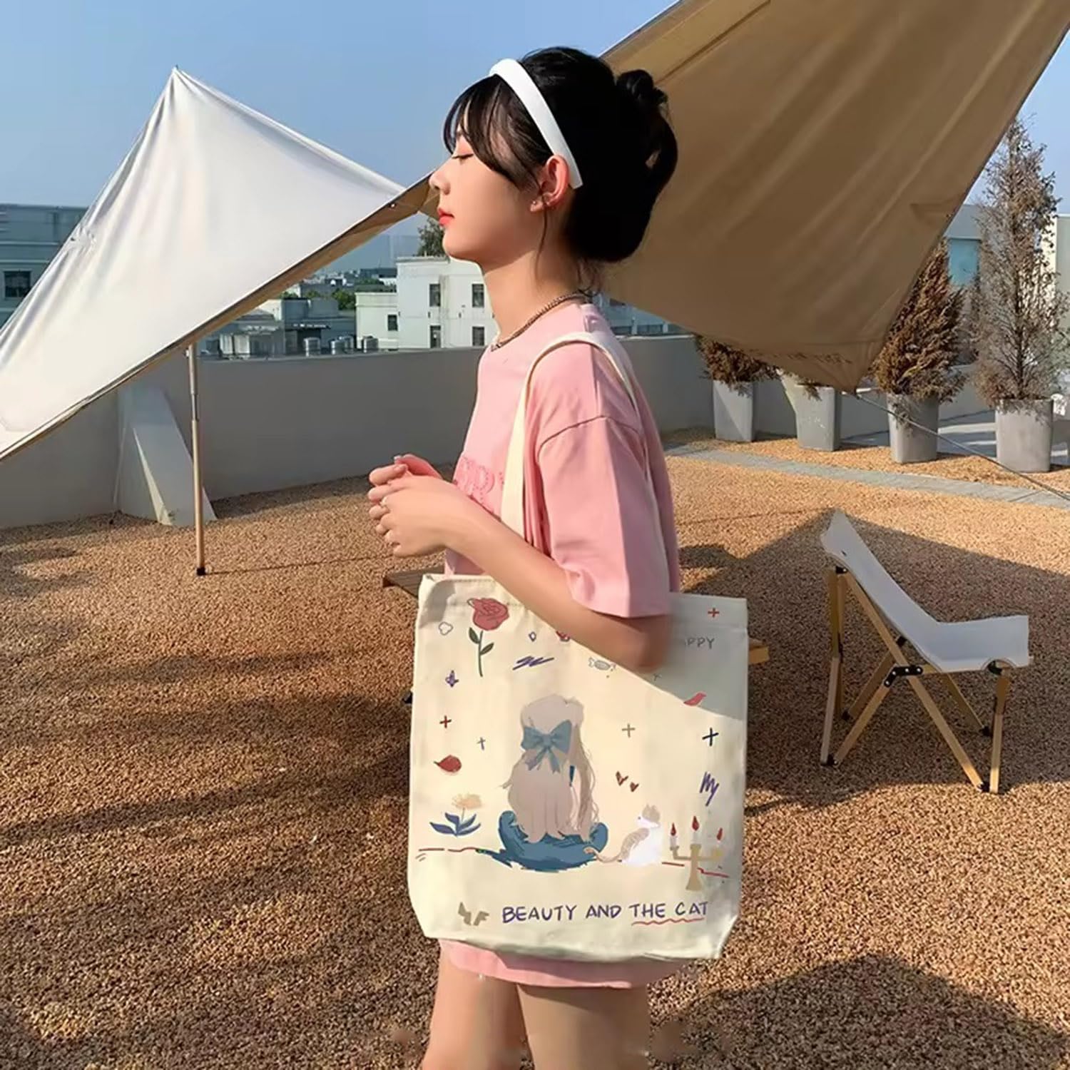 The Canvas Tote Bag features a trendy print that adds a cheerful vibe to your outfit, making it a stylish accessory for various occasions.